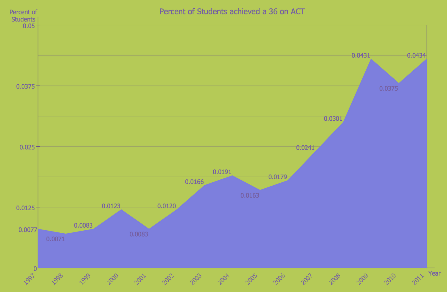 This Area Chart depicts the statistical percentage data about achievement by students the highest score 36 for the ACT (American College Testing) subject tests — English, mathematics, reading, and science reasoning, which are obligatory in the US for high school achievement and college admission. This sample was designed on the base of the Wikimedia Commons file "ACT-36-1997 to 2011.png". The data about results from 1997 to 2011 were collected and depicted in the diagram. The test on each subject from four ones is scored from 1 to 36, the composite score is calculated as an average score of all four tests. At the key points of the chart, you can see the percentage of students that achieved the top score 36 on the ACT in each year from 1997 to 2011 and it is easy to detect the years of the top result. These are 2009 and 2011 years when the result was the biggest and approximately equal – 0,0431 and 0,0434 correspondingly.