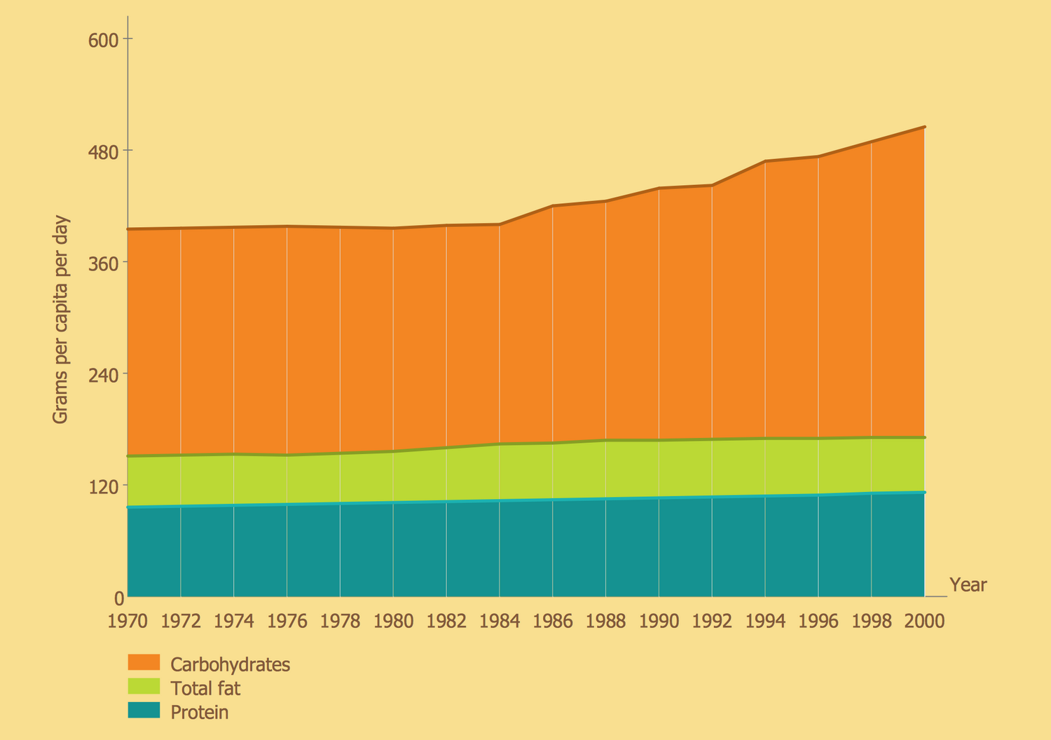 This Area Chart sample combines three Area graphs in one diagram. It contains data about food consumption in the United States for a period of 31 years (from 1970 to 2000) and shows the amount of protein, fat, and carbohydrate per person per day. The data were taken from US Center for Disease Control and Prevention (CDC) website and Roland Sturm's article about the childhood obesity, and the illustration was redesigned from the website of Food Consumption Data System, Economic Research Service of U. S. Department of Agriculture. The legend decrypts the correspondence of three main macronutrients to the colors used for them in this diagram, thus for the line depicting protein is used blue color, green for the fat, and orange for the carbohydrates. The vertical axis represents the grams of macronutrients per capita per day and on the horizontal axis are marked the years. The amount of protein and fat are almost constant throughout all the period. The amount of carbohydrates increases beginning from 1984 to 2000, until this period it is constant.