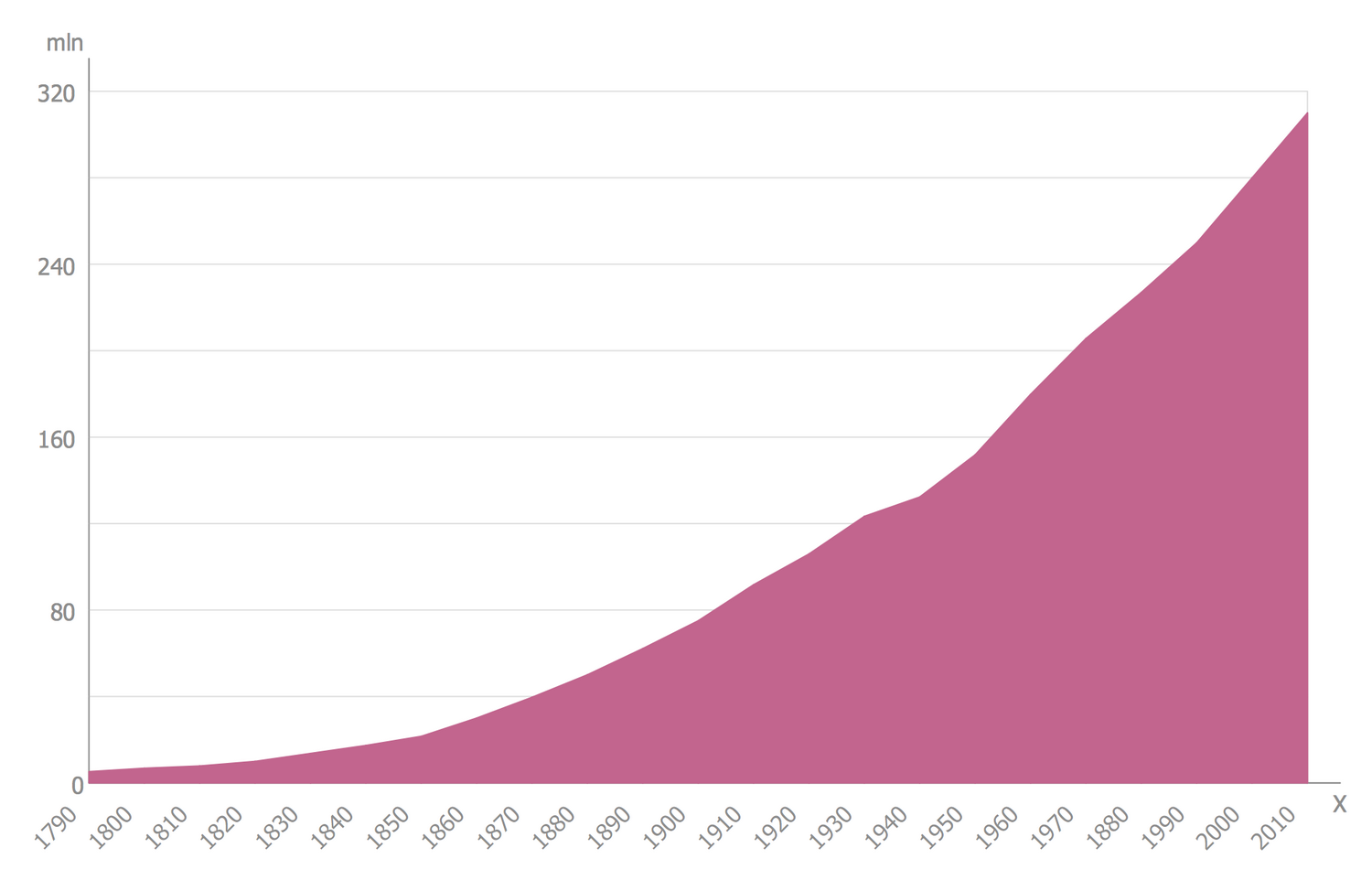 This Area Chart sample was designed on the base of the "US Census Population Graph from 1790.svg" Wikimedia Commons file and illustrates the growth of U.S. population in 1790-2010. The reference points were taken from the official United States Census data. The scale of years is divided itno the intervals equal to decades, the scale of the population is divided into intervals multiple to 80 million. We can observe fast and steady growth in the diagram. The similar Area Charts can be constructed for all US states separately and then compared with each other to track the tendency in each state. The diagram can be also prolonged to nowadays and it will be also growth because in 2016 the total resident population of United States was already 323 million that is bigger than approximately 310 million in 2010 according to the graph. While in 1790 there were only almost 4 million people in all US country.