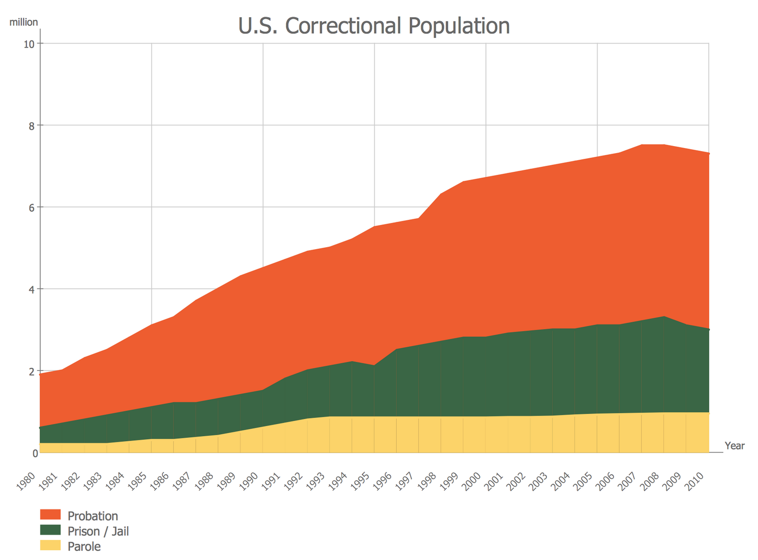 This Area Chart sample depicts statistics according to the correctional population of the United States. It is a timeline depicting quantities of people in the U.S. that were under adult correctional supervision from 1980 through 2013 for commission different offenses or felonies. The sample was designed on the base of the Wikimedia Commons file "US correctional population timeline.gif". There are separated those who were on probation, those who were in jail or prison, and who was on parole. The first group is depicted by red on the diagram, the second one by green, and the third one by yellow. The US has the largest number of prisoners in the world. According to the US Bureau of Justice Statistics (BJS) in 2013 0.91% of all adults were incarcerated in prisons. The peak was in 2008 when 7.46 million people were on probation, in jail or prison, or on parole. At this, the number of parole people kept approximately on one level from 1993 to 2013 including, in opposite to two other groups.
