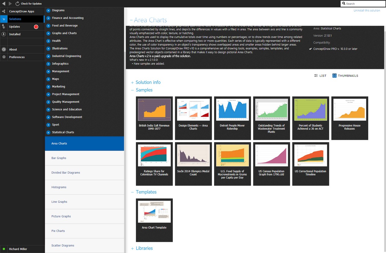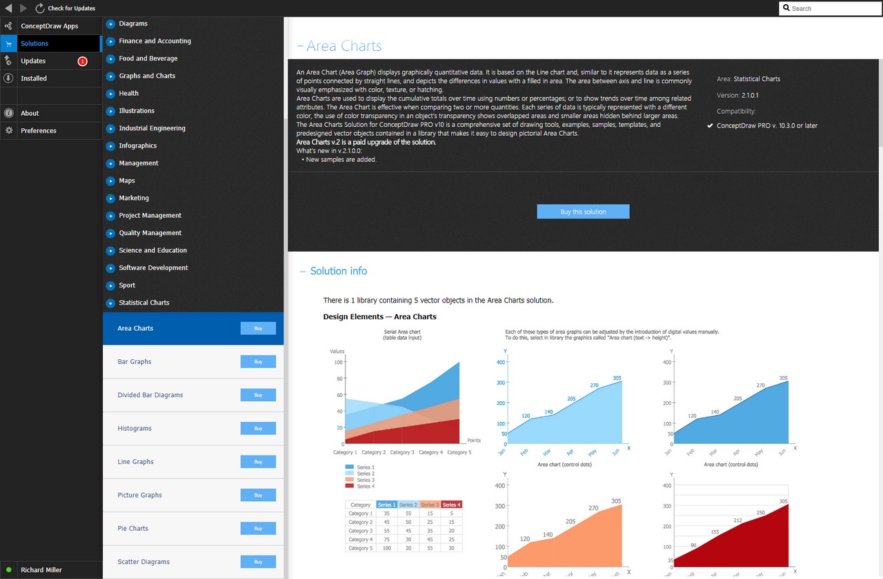 After ConceptDraw DIAGRAM is installed, the Area Charts solution can be purchased either from the Statistical Charts area of ConceptDraw STORE itself or from our online store. Thus, you will be able to use the Area Charts solution straight after.