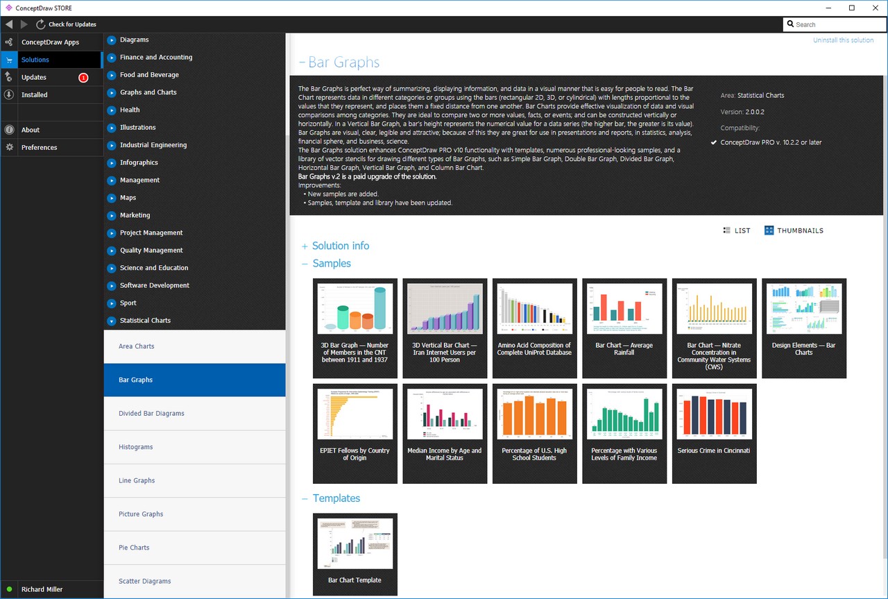 After ConceptDraw DIAGRAM is installed, the Bar Graphs solution can be purchased either from the Statistical Charts area of ConceptDraw STORE itself or from our online store. Thus, you will be able to use the Bar Graphs solution straight after.