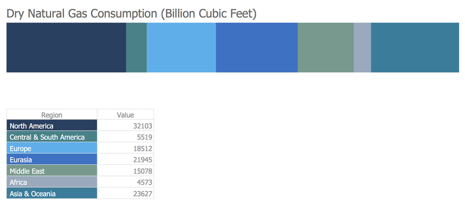This Divided Bar Diagram sample shows the global dry natural gas consumption by regions in 2013. Data are represented in Billion Cubic Feet for North America, Central & South America, Europe, Eurasia, Middle East, Africa, and Asia & Oceania. They were taken from the International Energy Statistics webpage that is the part of the U.S. Energy Information Administration (EIA) website. The values for different regions are represented at the table, on the base of which this Bar Diagram was constructed. Each region is filled with an individual color for easy identification according to the legend. The Divided Bar Diagram ConceptDraw's object let one easily draw Divided Bar Diagram, as well as change the segments number, remove or add the segments and color them in the desired way. Now, the values are hidden in the diagram, but you can show the absolute values from the table or percentage, as well as hide/show the legend or only the table.
