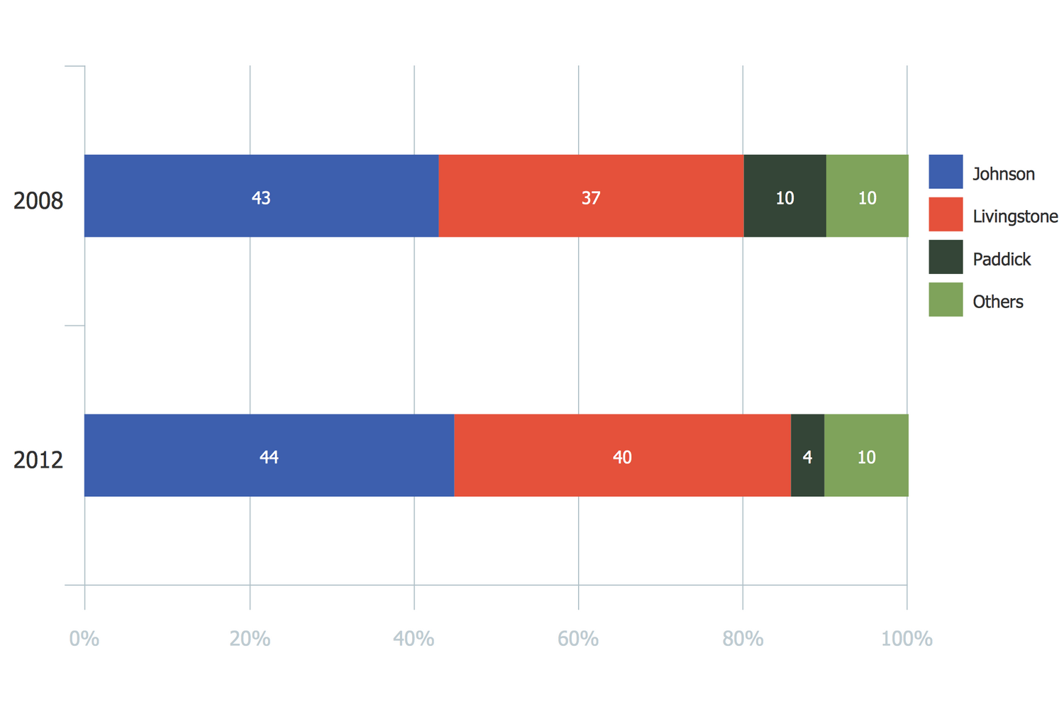 This Divided Bar Diagram sample demonstrates the London election results in 2008 and 2012. It was designed using data from the infographics "London Elections Results by Numbers" published on the london.gov.uk website that is an official website of London Assembly and Mayor of London. There are represented the election results for three main candidates: Johnson, Livingstone, Paddick, and the separate combined group representing other candidates. The results for different years are represented on the separated Bar Charts but placed one under the other that is incredibly convenient for comparing them. In addition, you can also observe the percentage scale, which allows you to additionally navigate in percentages. Color differentiation of candidates is also used. Thanks to all these advantages of ConceptDraw's Divided Bar Diagrams, it’s immediately noticeable that the first of the candidates listed got the largest number in both considered years, the second one is close to him, but still scored less, and the rest ones are behind.