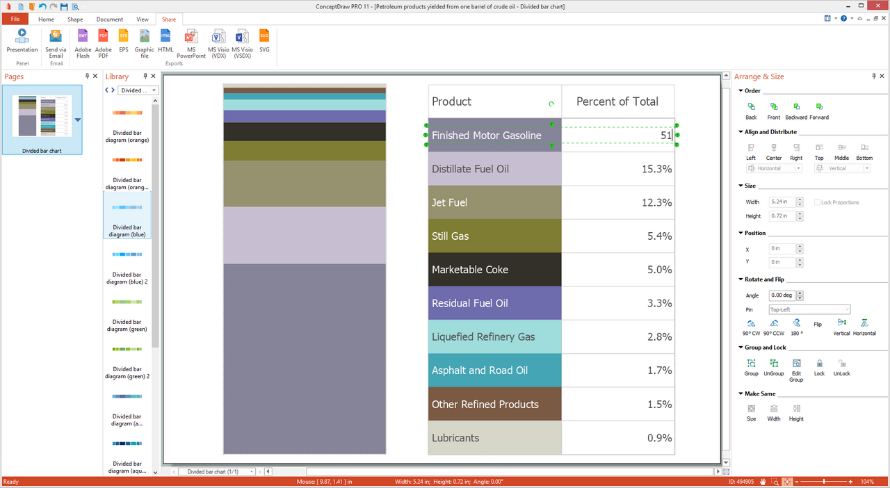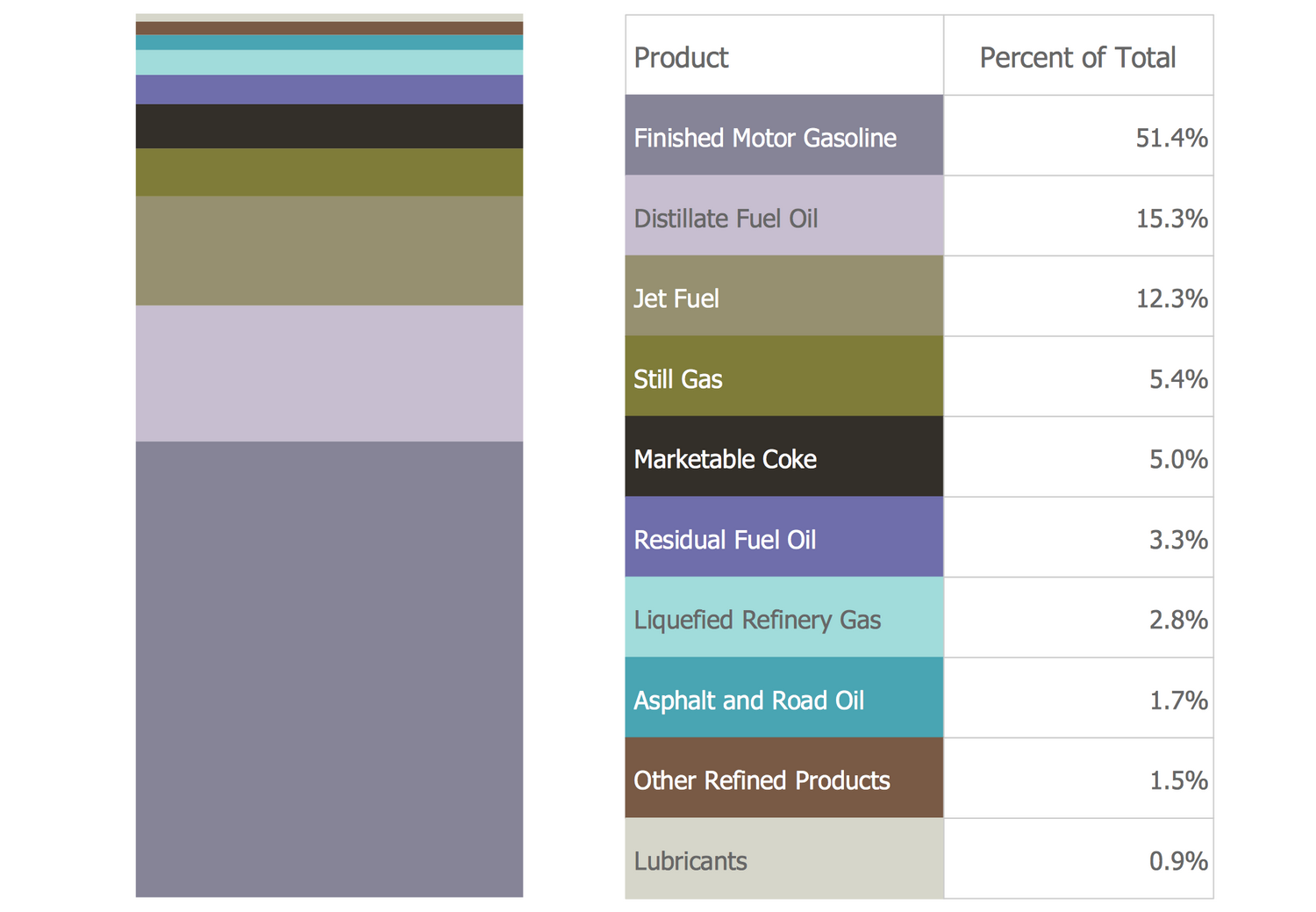 This Divided Bar Chart sample illustrates the full list of petroleum products yielded from 1 barrel of crude oil in California in 2004. This sample was designed using data from the chart published on the California Energy Almanac website. The percentage composition of the products is reflected at the table and in the Divided Bar Chart. When considering carefully this diagram you will immediately notice that the finished motor gasoline comprised the largest part of the produced oil products, namely 51.4%, distillate fuel oil amounted 15.3%, jet fuel 12.3%, the rest ones are still gas, marketable coke, residual fuel oil, liquefied petroleum gas, asphalt and road oil, other refined products, and lubricants, the part of each of which ranges from 5.4% to 0.9%. Note also that the percentage ratios are sorted from larger to smaller in the table and from smaller to larger (from top to bottom) in the chart. This chart is located vertically, but you can draw Divided Bar Graph of any orientation in ConceptDraw DIAGRAM, as well as rotate it to the desired angle.