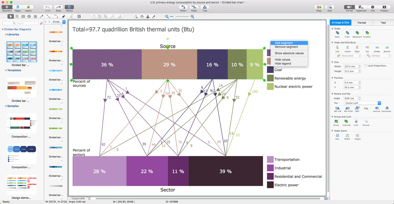 Start using the Divided Bar Diagrams solution to make the professionally looking numerical data by adding the design elements taken from the stencil libraries and editing the pre-made examples that can be found there.