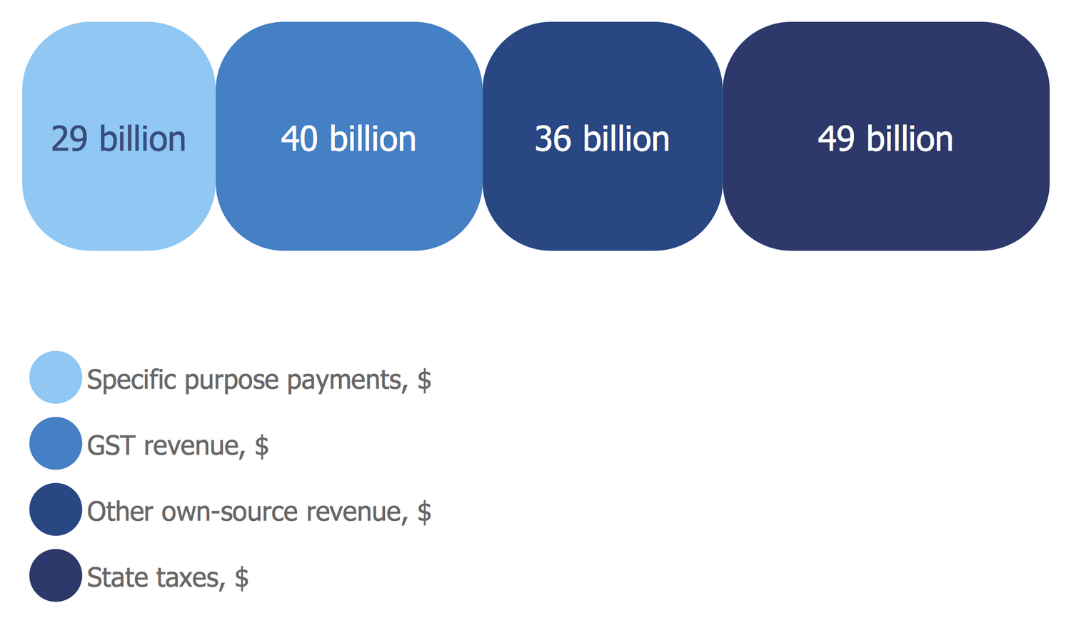 This Divided Bar Diagram sample is based on the chart "Composition of state government revenue in 2006‑07" published on Australia's future tax system website and depicts the composition of Australian state government revenue in 2006‑2007. The use of Divided Bar Graph to compare data provides one with plenty of opportunities to use methods that allow you to focus the attention of your audience to particular aspects of the comparison. The order you put the categories is one of such methodologies. In the offered case, the order of the categories is enhanced by the intensity of color. The extrema are marked with a minimum and maximum color intensity, respectively. At this, the correspondence of colors to the categories, you can find in a legend. Among the offered categories we can observe the specific purpose payments comprised $29 billion, GTS revenue that is an Australian government tax comprised $40 billion, other own-source revenue $36 billion, and state taxes $49 billion.