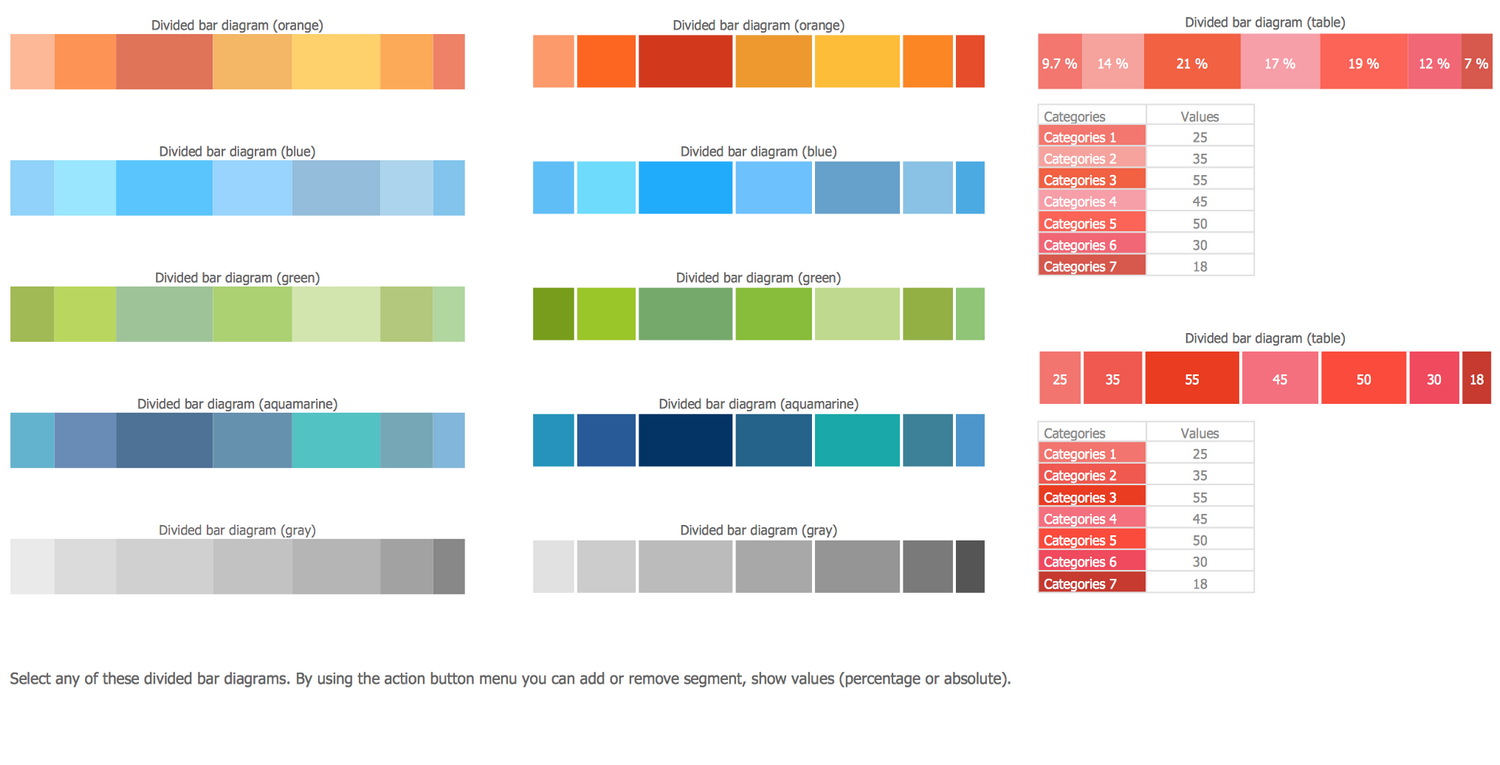 This Divided Bar Chart template is a good base for designing your own professional-looking Divided Bar Chart. It is also a detailed instruction on how to draw Divided Bar Chart, at this unambiguous and clear. You can observe the diagram and table on this template. All input values for each category are entered into the table and on their base, the Divided Bar Diagram is automatically constructed. The legend represents the description of categories and can be shown/hidden, on your desire. You are also free to choose the colors on your taste, just clicking on the category in the table and changing its color, and it will be automatically changed on your chart. The menu commands available in result of action button clicking, allow you to add/remove segments, set segments number, show percentage or absolute values, show/hide values, legend, table. The legend is combined with a table in this template, you are able to hide the table’s part leaving only the legend visible or to hide them both.