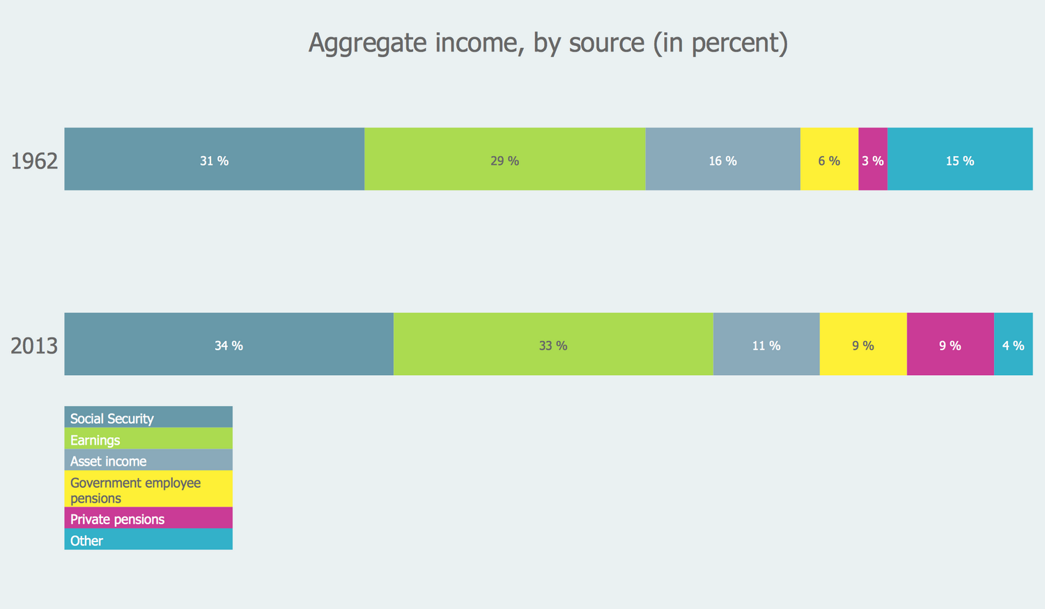 Divided Bar Diagram is a good choice to visually represent data divided into categories for further easy comparison them. This Divided Bar Chart was constructed on the base of data from the website of the U.S. Social Security Administration (SSA) and illustrates the shares of aggregate incomes by the source in percent in 1962 and 2013 separately, as well as lets one easily compare their values. There are included several categories of incomes: earnings, asset income, government employee pensions, private pensions, and others. Each of these categories is colored differently from other ones and all they are represented on both bars in corresponding proportions. The correspondence of colors is represented in a legend. You can see that data for 1962 and 2013 significantly differ and especially large this difference is for the private pensions and other incomes. If in 1962, they were 3% and 15% correspondingly, in 2013 we can observe that they count 9% and 4%.