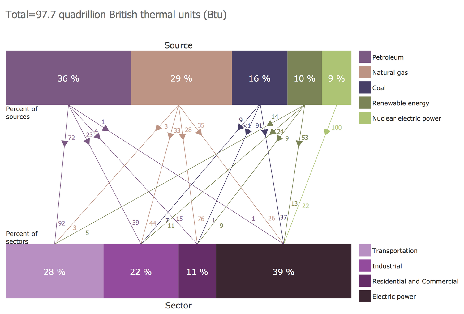 This Divided Bar Diagram sample represents in expanded form the consumption of primary energy by sources and main consumer sectors in the U.S. in 2015. The chart is based on data from the U.S. Energy Information Administration and the article "U.S. Energy Facts Explained, Consumption & Production". The total consumption amounted to 97.7 quadrillion Btu (British thermal units) in 2015. There are used many sources of primary energy in the U.S., among them petroleum, natural gas, coal, renewable energy, and nuclear electric power. The percent values of consumption all them in 2015 are depicted in the first Bar Diagram. The second one represents the percent proportions of the main consumer sectors, such as transportation, industrial, residential and commercial, electric power; the last one is the biggest. The use of each source greatly varies by sectors. Thus, natural gas provides 3% of the energy used for transportation, 35% to generate electricity, 33% of the energy for industrial, and 28% for the residential and commercial sector; the nuclear electric power is used only for electricity, etc.