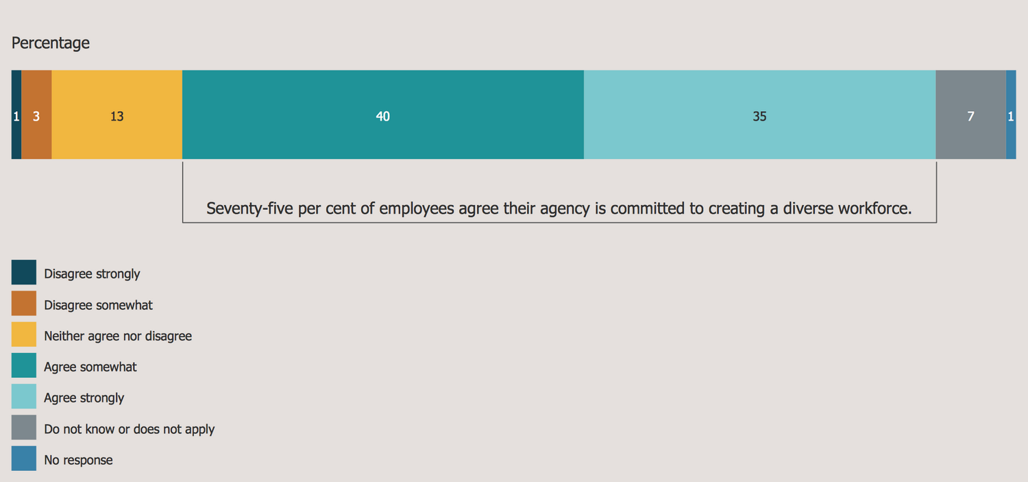This Divided Bar Diagram demonstrates the results of the public poll about the aspiration of the agency to the creation of a diverse workforce. It was designed on the base of the "Employee perception survey results" article from the website of the Public Sector Commission, the Government of Western Australia. The Employee perception survey is conducted each year by the Public Sector Commission and is the part of its annual survey program directed on the improvement the work of public sector agencies and authorities in questions of planning and awareness-raising. The quick look at the diagram lets instantly remark the opinion of the vast majority — the "agree somewhat" people amounted 40%, while the minority (1%) are "disagree strongly", and 1% also amounted "no response". It is also depicted the union of people "agree somewhat" and "agree strongly", their total quantity comprised 75% — all these employees agree their agency is committed to creating a diverse workforce.