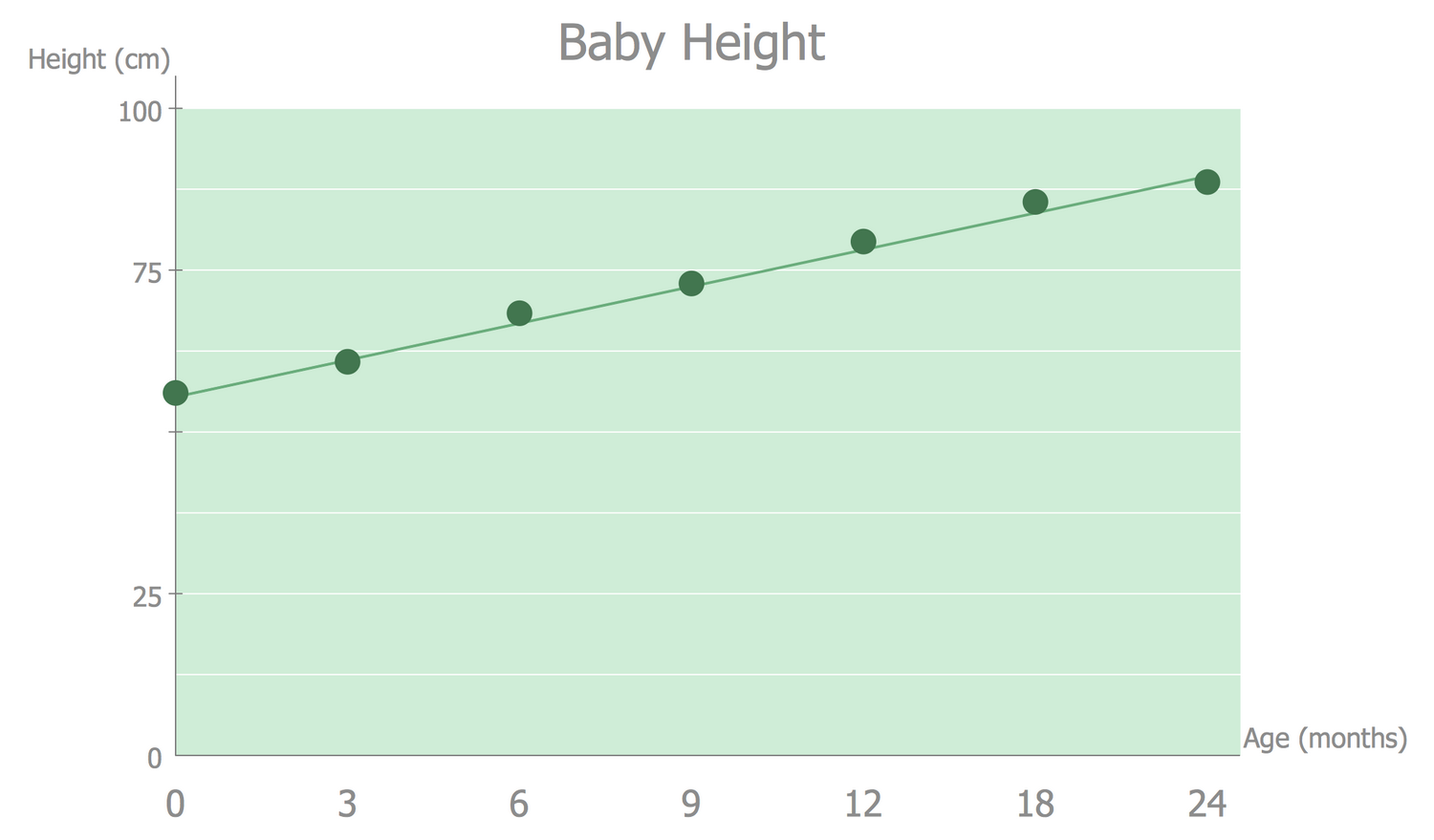 This Line Graph sample is dedicated to exploring the changes in baby height from birth to 24 months. It was constructed on the base of the Wikimedia Commons file "Babyheight.png". You can observe the straight-line graph illustrating the linear dependence of baby age to height beginning from the middle statistical newborn's height. At the same time, you can also observe the dots made in the course of actual weighings of the child, which at some moments slightly deviate from the main line, however, are within normal limits and do not cause concern, while the strong deviations of measurements from the Line chart may require attention. ConceptDraw DIAGRAM allows one to display the results of weighing any number of children from 0 to 24 months on this graph and to visually compare the values to identify differences, the cases of complete coincidence with the line graph, or vice versa significant deviations from it. For convenience, use a new color for each case.