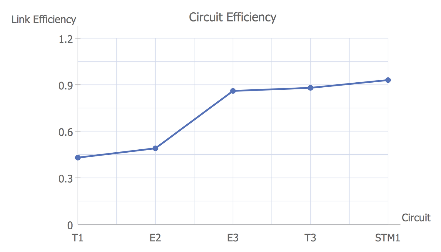 This Line Graph sample illustrates the circuit efficiency for telecommunications. It was constructed on the base of the Wikimedia Commons file "Circuit efficiency Erlang B.png". Agner Krarup Erlang (1878 – 1929) was a famous Danish mathematician, engineer, statistician, scientist the first studying the problem of telephone networks, the founder of teletraffic engineering, and developer of the fundamentals of trunking theory dedicated to the aggregation of multiple user circuits into a single channel. It based his researches and works on the statistical nature of the arrival and the length of calls. The Erlang B formula lying at the base of this chart allows calculating the number of circuits required in a trunk based on the amount of traffic in Erlangs needed to cater the trunk and the Grade of Service. Today, the Erlang B formula is used to calculate the number of telephone lines needed for a call-center or mini ATS depending on the expected number of calls.