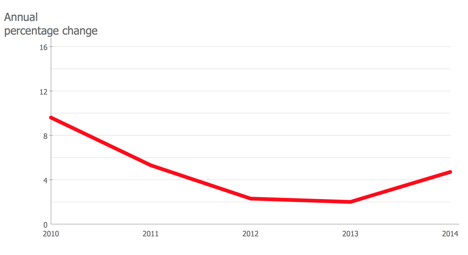 This Line Graph is based on the data of the Ministry of Economy and Finance of France and demonstrates the data from the European Economic Forecast for the exporting of different goods and services by France. France is one of the largest exporters in the world that exports a wide variety of goods to neighboring European countries and other world countries. Among the exported goods are food and wines, chemicals, pharmaceuticals, aircrafts, industrial machinery, electronics, motor vehicles, iron and steel. Having this visual graph illustrating the annual percentage change you can note that according to the offered data the export of France decreased in a period from 2010 to 2013, the minimum in 2% was achieved in 2013. ConceptDraw DIAGRAM lets one design similar graphs for other countries in minutes and then visually compare them, as well as to make economical forecasts and supposes, to construct economical calendars, analyze statistics, etc.