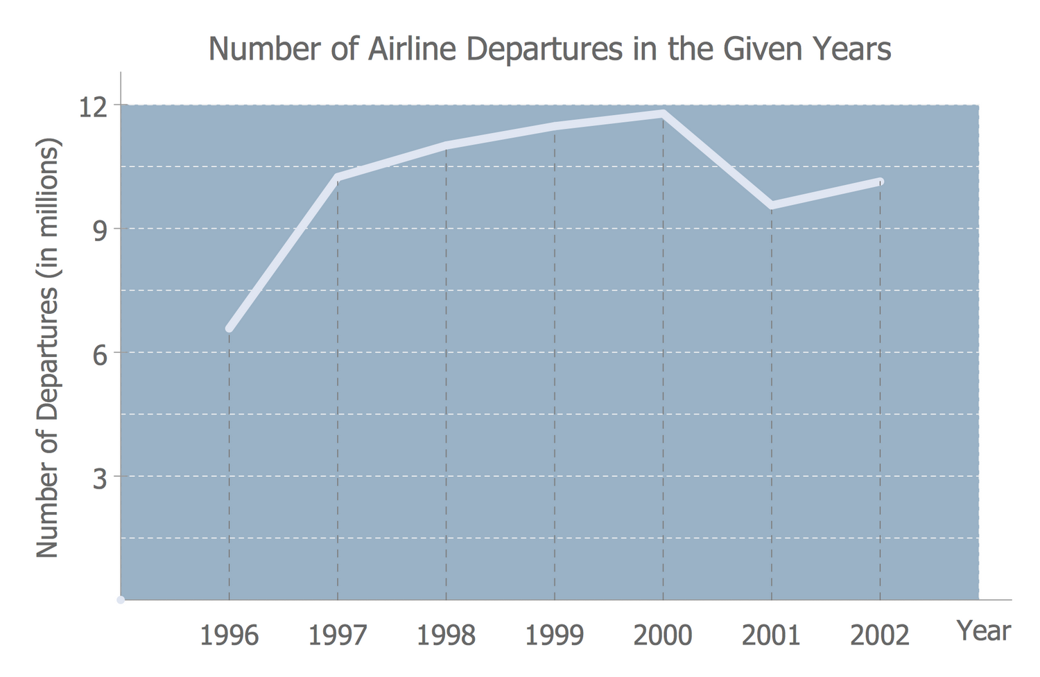 What is a Line Chart? It is a type of chart that represents data as a series of points connected with a line. The Line Charts are incredibly helpful in various fields, including the social and economic sciences, they can be used to visually illustrate the economic principles and trends. This Line Chart depicts a period of seven years (1996-2002) and the corresponding statistical data on the number of airline departures for each of these years. It was designed on the base of Wikimedia Commons file "-6 time series.jpg" using the ready-made object from the Line Graphs library of the ConceptDraw's Line Graphs solution. The number of departures is represented in millions and you can see that it steadily grew from 1996 to 2000 when their maximum was achieved and counted 12 million, but after this, one can note the little decrease to a bit more 9 million in 2001 and about 10 million in 2002. In this way can be constructed the Line Graphs illustrating statistical data in arrivals, in departures for specific countries, specific airline companies, etc.