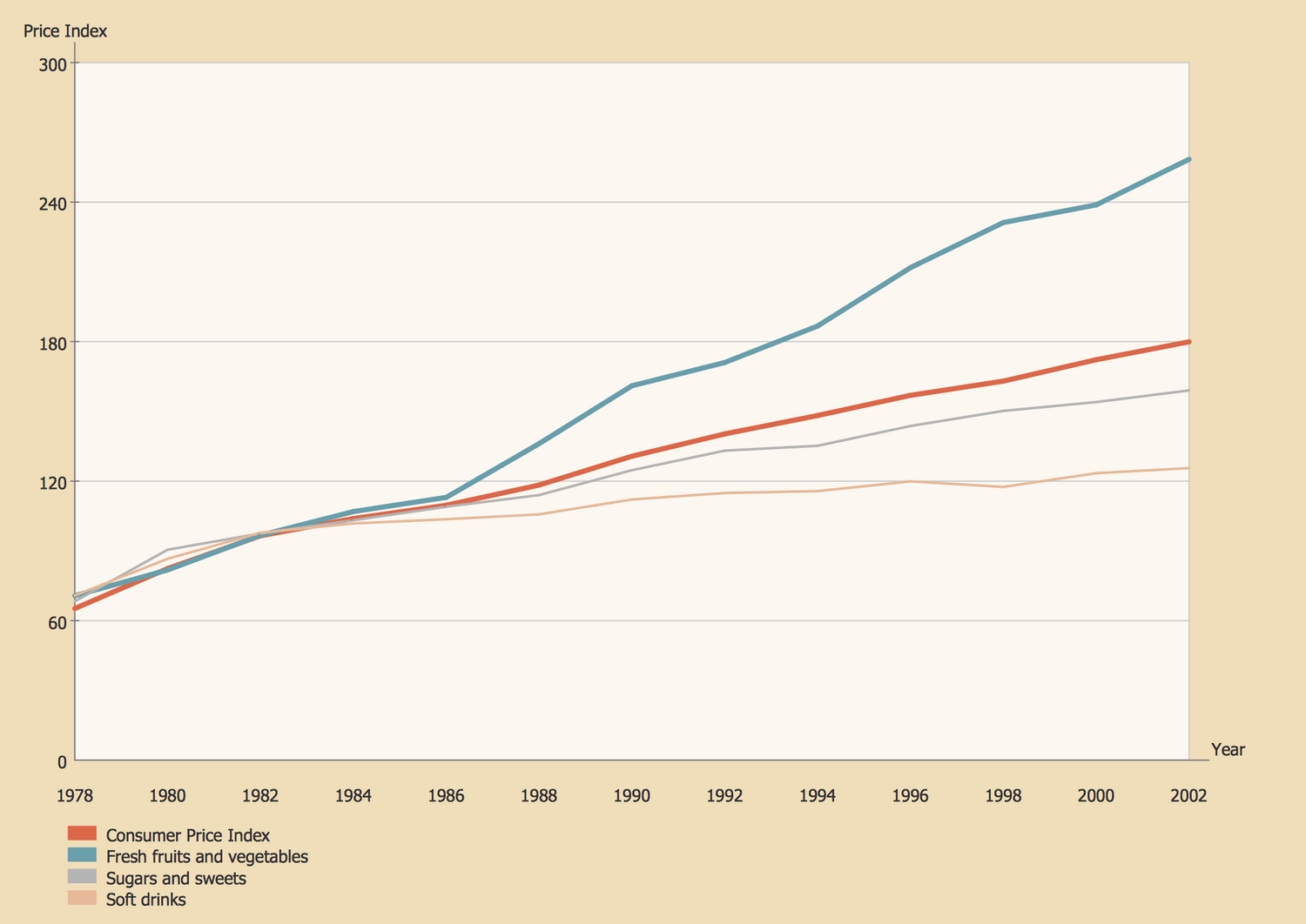 This sample represents the Line Graphs of changes in prices depending on year for different groups of goods in a period from 1973 to 2002. There are represented the Line Graphs for the consumer price index, fresh fruits and vegetables, sugars and sweets, and soft drinks, and differed by colors. Varied coloring is applied for easy visual assessment and comparison of the dynamics with one look. This sample is based on the data from the website of the United States National Center for Chronic Disease Prevention and Health Promotion. You can observe the tendency of growing the prices on all considered groups of goods, at this on some goods it is significant growth. Thus, for fresh fruits and vegetables you can see the increase in the price index from 70 to 260, at this the critical point from that we notice the dramatic growth is in 1986. While for the soft drinks we have relative stability and growth is only from 70 to 130.