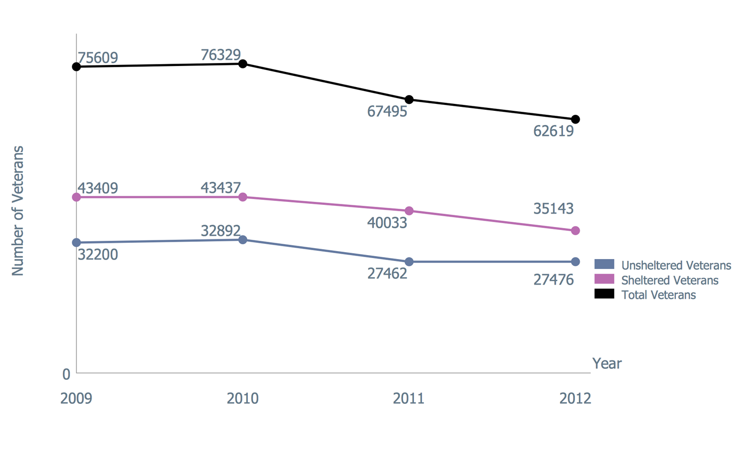 This Line Chart sample is based on the data from the U.S. Department of Veterans Affairs (VA) website and illustrates the number of sheltered and unsheltered homeless Veterans, and their totals during the annual Point in Time (PIT) from 2009 to 2012. The count was realized by the U.S. Department of Housing and Urban Development. Different colors were chosen for the Line Charts demonstrating unsheltered veterans, sheltered veterans, and total veterans. U.S. Department of Veterans Affairs protects the rights of veterans and provides the programs helping all Vets and their families to find homes. The ending of Veterans' homelessness is a top priority of VA and it is the goal that it realizes along with federal, state, and community partners. According to the chart, the actions of the VA are successful and the number of homeless veterans decreases every year. Moreover, this chart can be easily prolonged to nowadays to represent the current results.