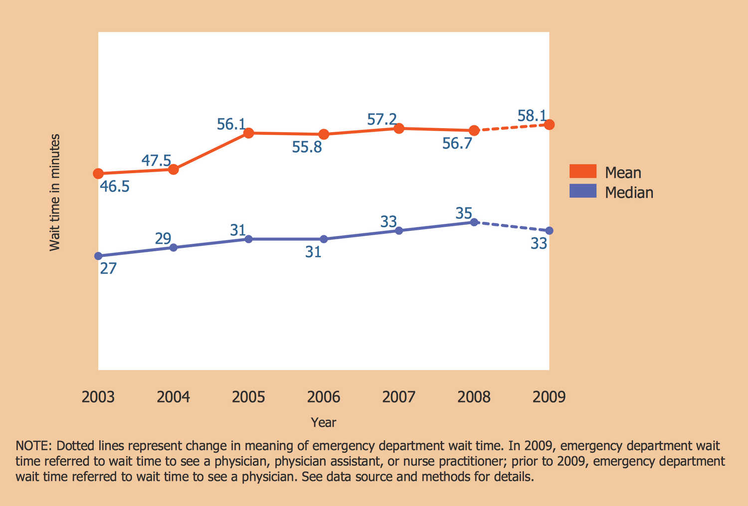 This Line Graph sample represents the mean and median wait time for treatment in the hospital emergency department. The chart is constructed for the United States and is based on the data collected for 2003–2009 and published on the website of the U.S. Department of Health & Human Services, National Center for Health Statistics, Centers for Disease Control and Prevention (CDC). The dotted lines represent the change in the meaning of emergency department wait time. Prior to 2009, the emergency department wait time referred to wait time to see a physician, while in 2009, the emergency department it referred to wait time to see a physician, physician assistant, or nurse practitioner; The mean wait time values are depicted by red color, for the median values is used blue. One can observe that the mean wait time increased from 46.5 minutes to 58.1 minutes in a reported period and the median time also increased from 27 minutes to 33.