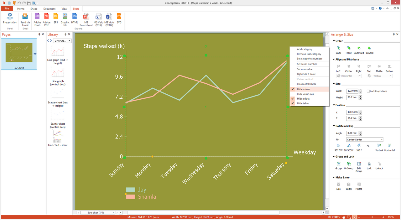 This Line Chart template is ideal quick-start in drawing a Line Chart. Filling the table with new data will lead to automatic reflecting the changes on the chart, equally as the change of colors in the table’s head will be automatically applied for the chart and depicted at the legend. The Line Chart axes represent the categories and values. How to draw a Line Graph the most quickly? Type the names of categories and series. Use the table to input values for the categories of appropriate series. By using the “Set max value” action you can change a display scale of the main variable. The y scale can be also optimized using the corresponding action. The number of categories can be changed as well, it is possible to add or remove the categories. The use of the “Set series number” action allows adding up to four series. The distance between categories is regulated by a control dot. You are able to show or hide values, value axis, edges, and table, to choose inclined or horizontal labels, to set the vertical displaying of values.