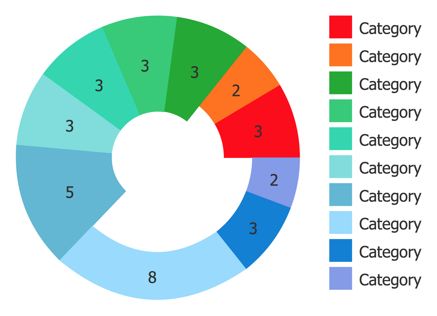 There are several types of Pie Chart design — the sectors can be located at a short distance one from another or be joined into one whole, or even have a hole inside as a Donut Chart. You can also meet a variant, when some sector or group of sectors are slightly displaced from the common disk for additional emphasis on their importance. Pay special attention to the effective use of a bright color palette in your Pie Charts, which provides a visual division of information that facilitates greatly the interpretation and perception of information, and increases its understanding. Don't forget to add a legend or a table of values and correspondence of colors used on the chart. It is also recommended to control the number of sectors, because this type of chart the best suits and is the most informative for not very large number of them, else when the segments are thin and there are a lot of them, it is difficult to identify visually on how much one sector is larger than another.