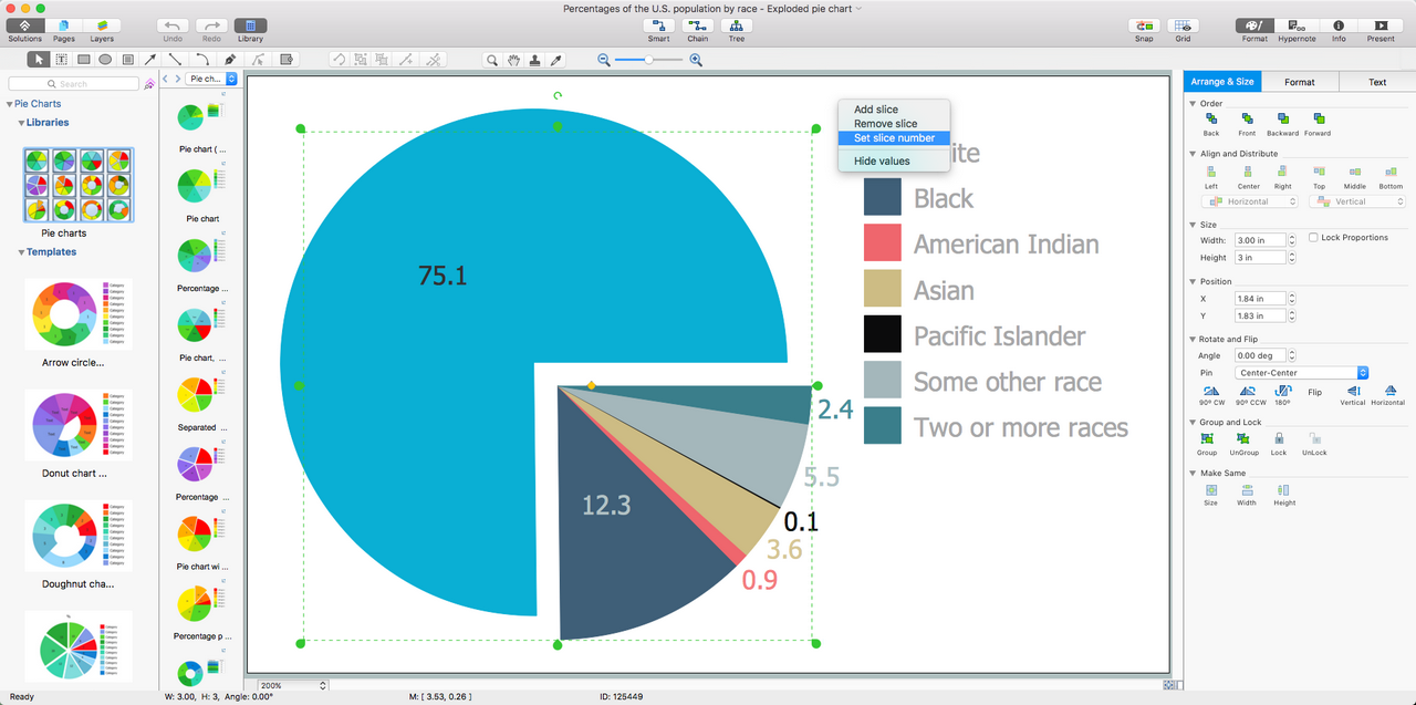 This Exploded Pie Chart sample was constructed on the base of the United States Census Bureau data and "Percentages of the U.S. population by race — 2000.png" Wikimedia Commons file. It illustrates the racial make-up of the U.S. in 2000. According to the diagram, the percentages of the U.S. population were distributed with a predominance of the white race population that comprised 75,1%, at the same time the black race also comprised a significant part of the population 12,3% in 2000. The white race is represented by the population originated from Europe, the Middle East, and North Africa. The remaining racial shares were not so numerous and constituted respectively: American Indian (0,9%), Asian (3,6%), Pacific Islander (0,1%), two or more races (5,5%), and the group including some other races (2,4%). Moreover, all these sectors comprising the minority are visually highlighted by their slightly offset from the big sector on this Pie Chart.