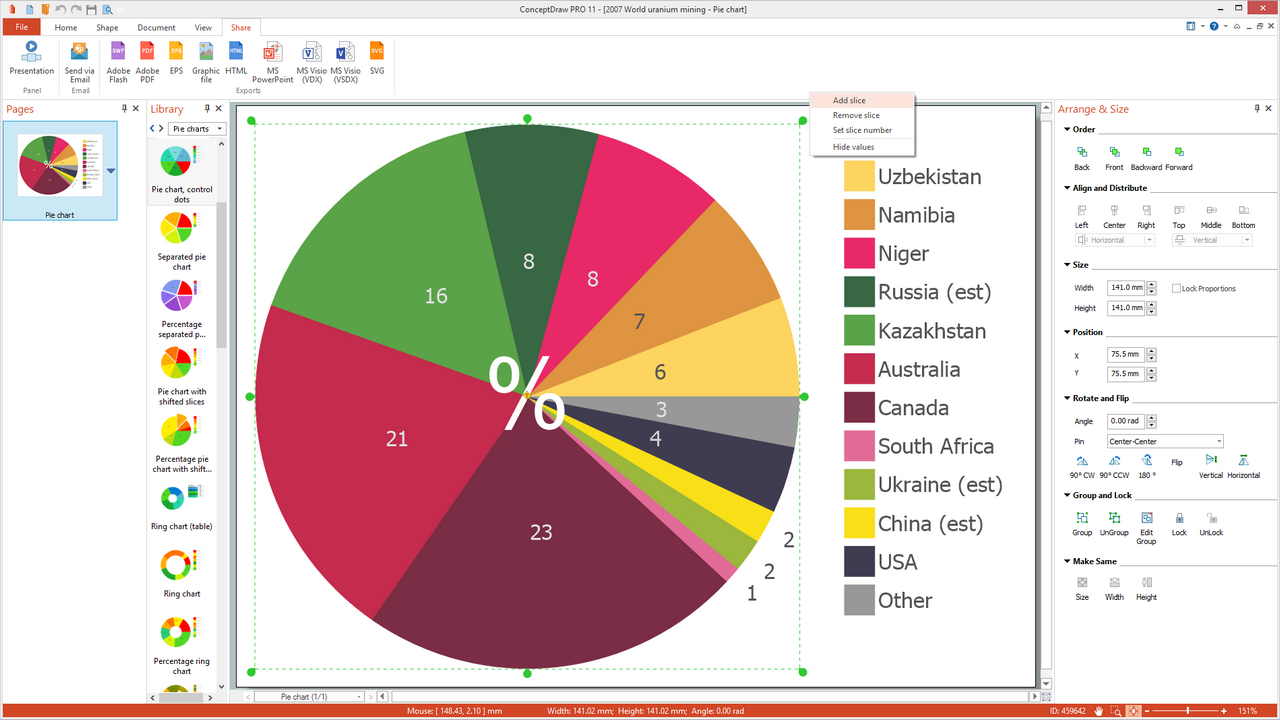 This Pie Chart sample shows the world uranium mining by countries in 2007. It is based on the data from the "2007Uranium.PNG" Wikimedia Commons file and the World Nuclear Association (WNA) data. The uranium is the most energy-intensive fuel, only several kilograms of uranium can produce the same amount of electricity and heat as tons of coal and oil or thousands of cubic meters of gas. Among the countries occupied by the extraction of uranium from the ground and having its reserves are Uzbekistan, Namibia, Niger, Russia, Kazakhstan, Australia, Canada, South Africa, Ukraine, China, USA, and other countries. At this, Canada, Australia, and Kazakhstan occupy the leading positions in this process and mine 23%, 21%, and 16% correspondingly from the whole world's amount of extracted uranium in 2007. The placement of the percent symbol in the middle of this Pie Chart significantly lightens it, when the typing of this symbol near each number can lead to the chart's visual overloading.