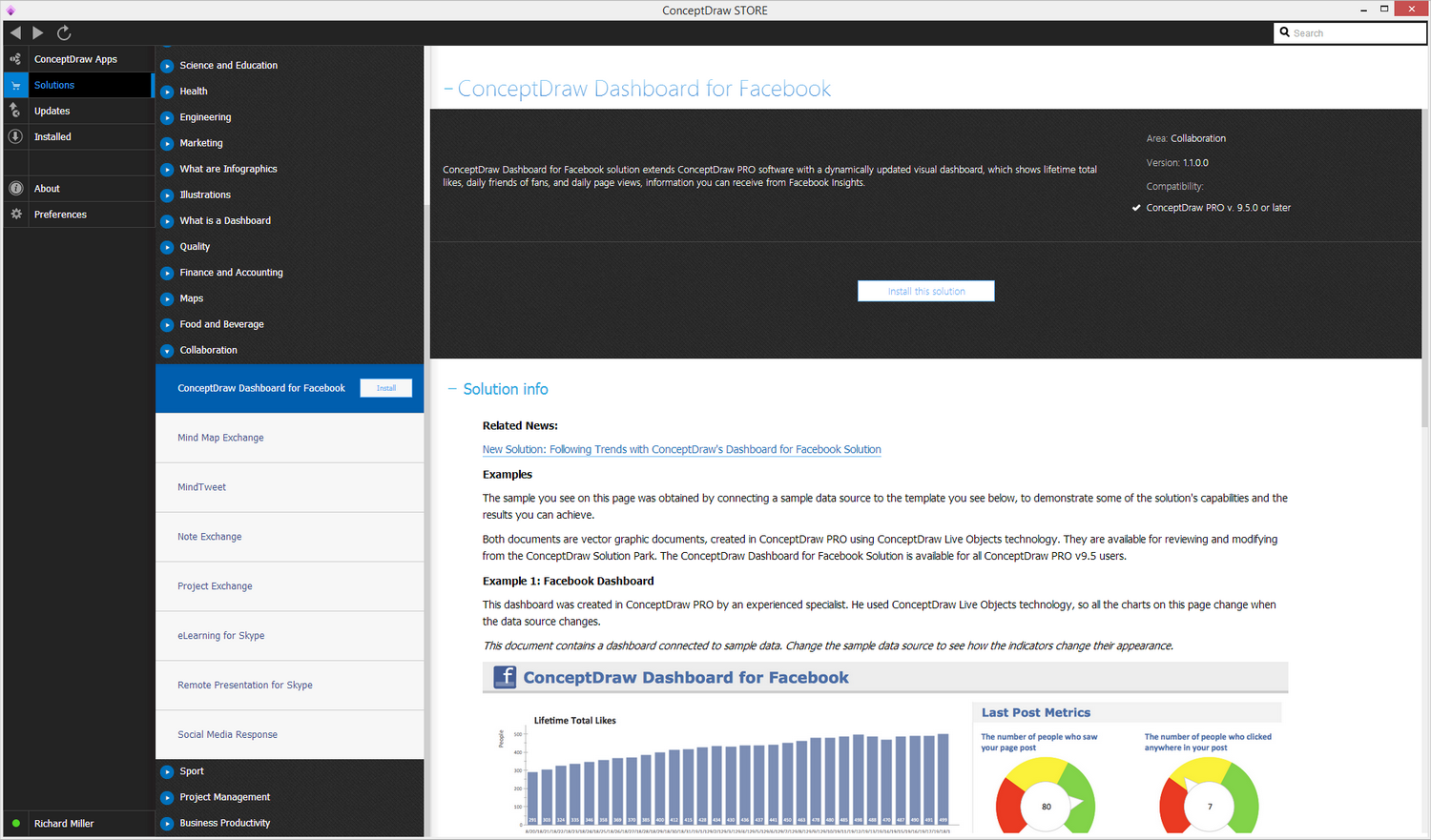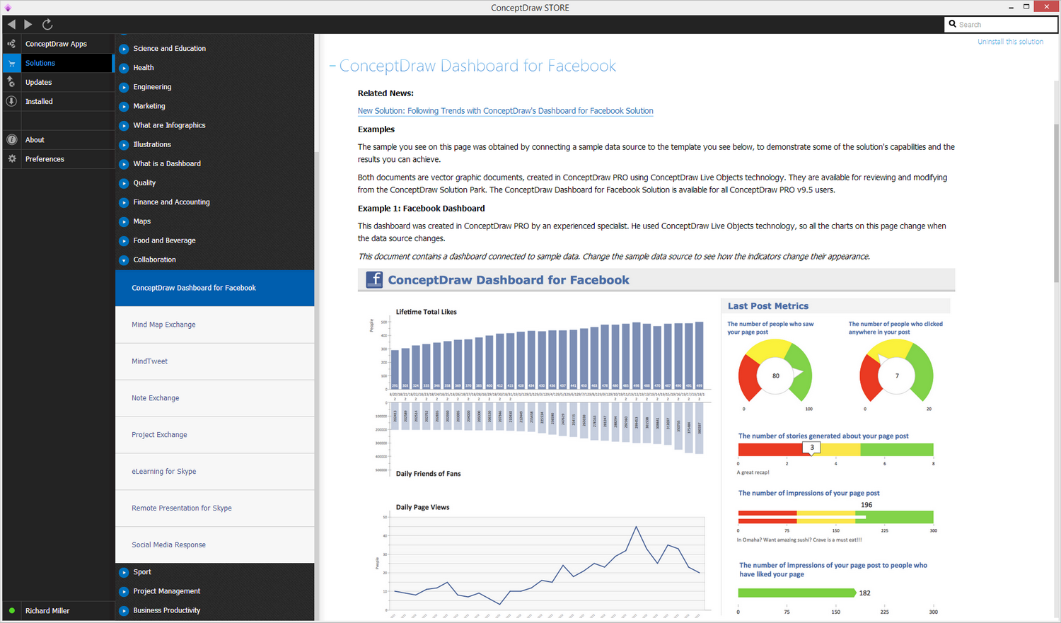 Download and install ConceptDraw STORE and ConceptDraw DIAGRAM. Next install the “ConceptDraw Dashboard for Facebook” solution using the STORE.