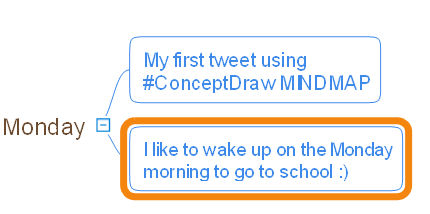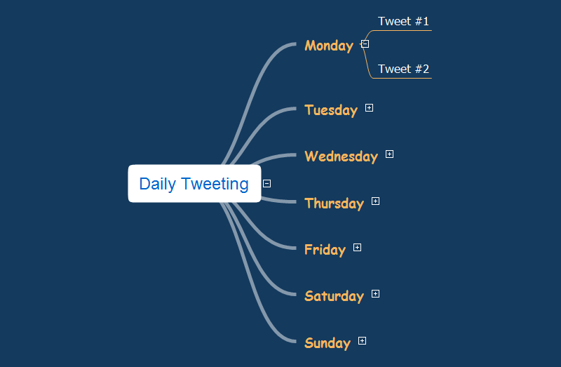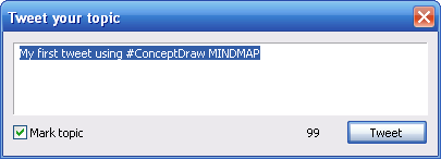Tweeting: Once your Tweets are organized and ready, you can Tweet them directly from your mind map. Select a topic you want to post, and click the “Tweet Topic” button on the toolbar. After you verify the text and number of characters, click OK. Your topic is automatically posted to your Twitter account.