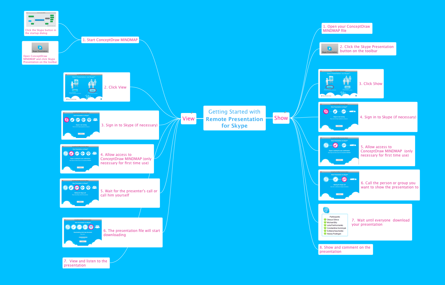 * Remote Presentation for Skype is not supported in newer versions of Skype. The API used to communicate between users of ConceptDraw MINDMAP has been discontinued by Skype. For current list of products and versions of those products required for the proper operation of this solution please view “Compatibility”.