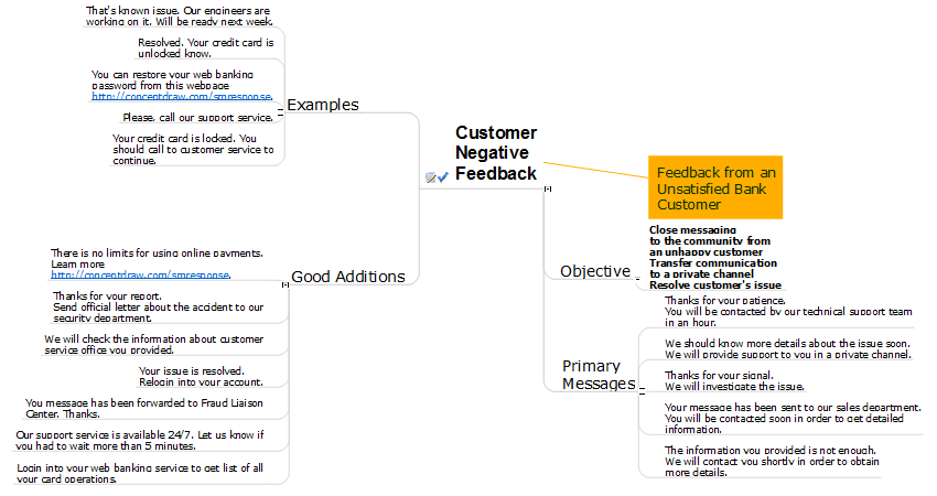 The samples you see on this page were created in ConceptDraw DIAGRAM and ConceptDraw MINDMAP to illustrate a methodology proposed in the Social Media Response solution. The Interactive Flowcharts and Action Mind Maps demonstrate the solution's utilization, and the documents you can create using this solution.