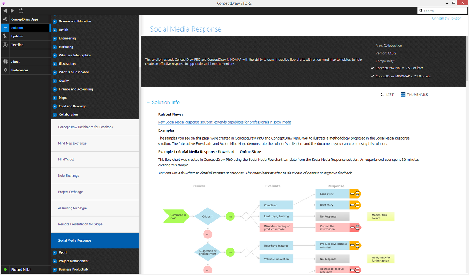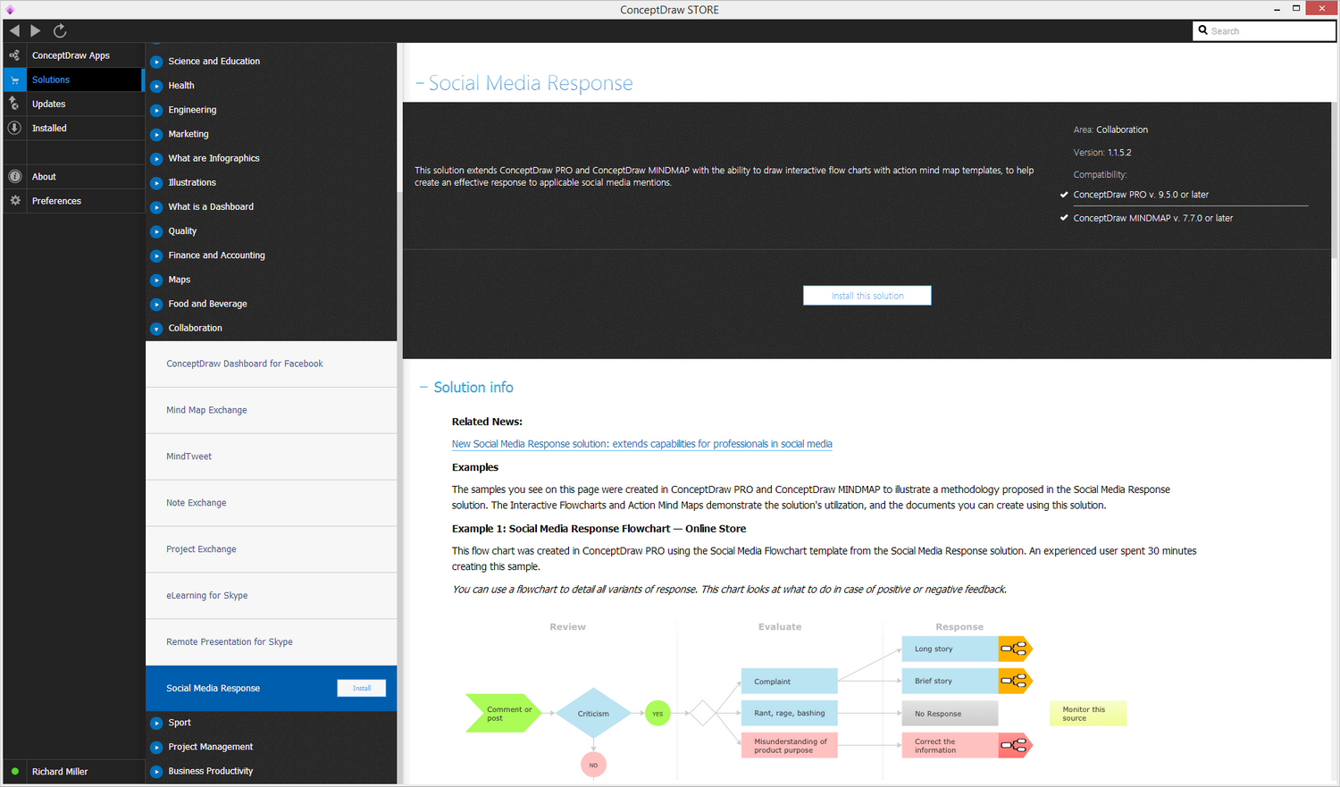 Download and install ConceptDraw DIAGRAM, ConceptDraw MINDMAP and ConceptDraw STORE. Install the «Social Media Response» solution using STORE.