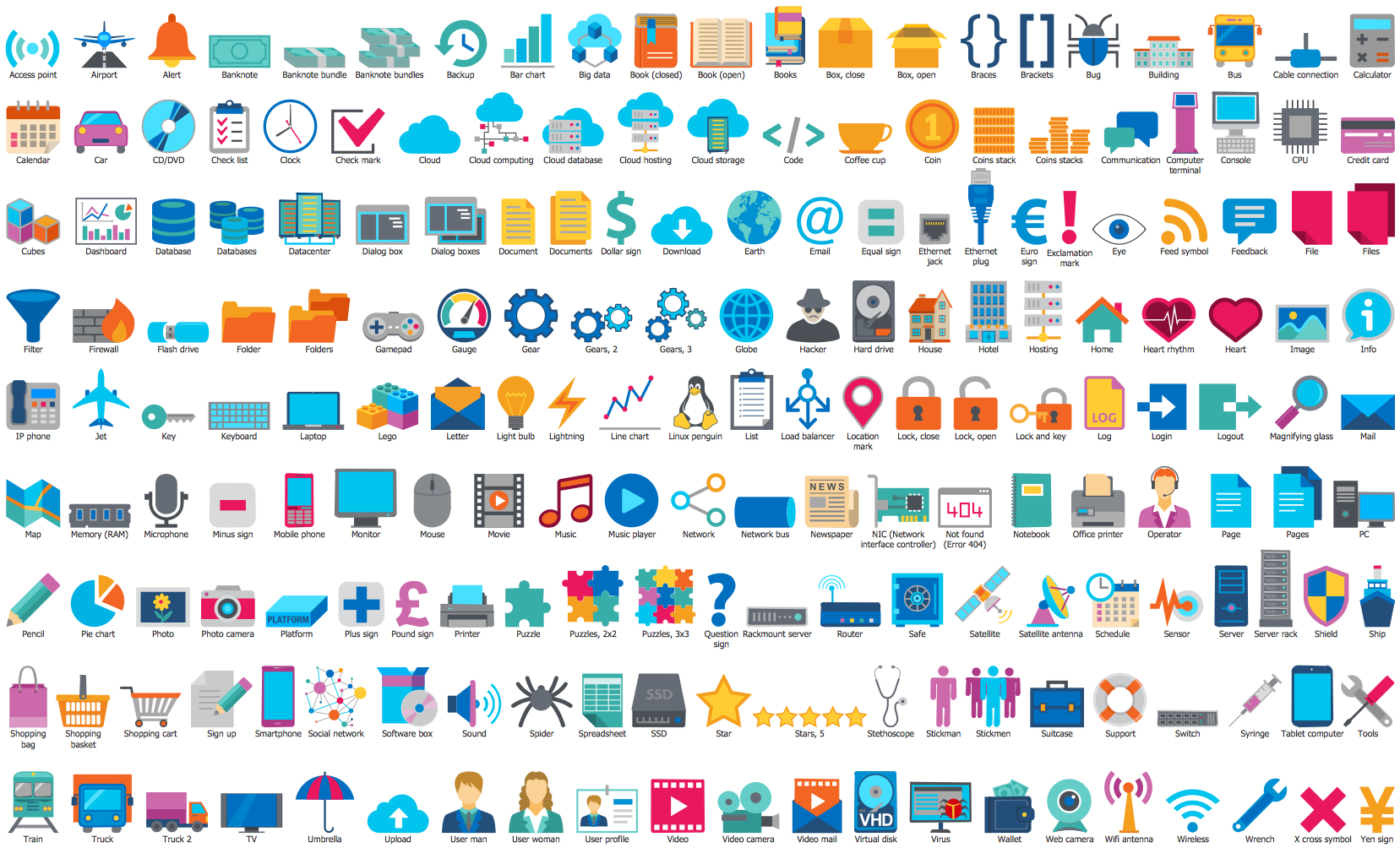 9 solutions, 38 libraries, 2 270 vector object and icons, 116 examples and templates.
