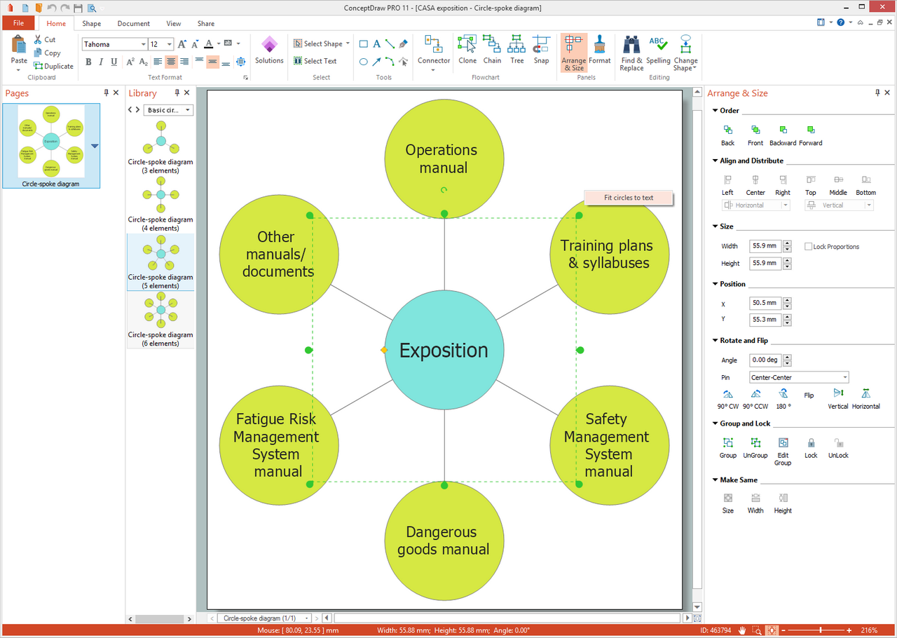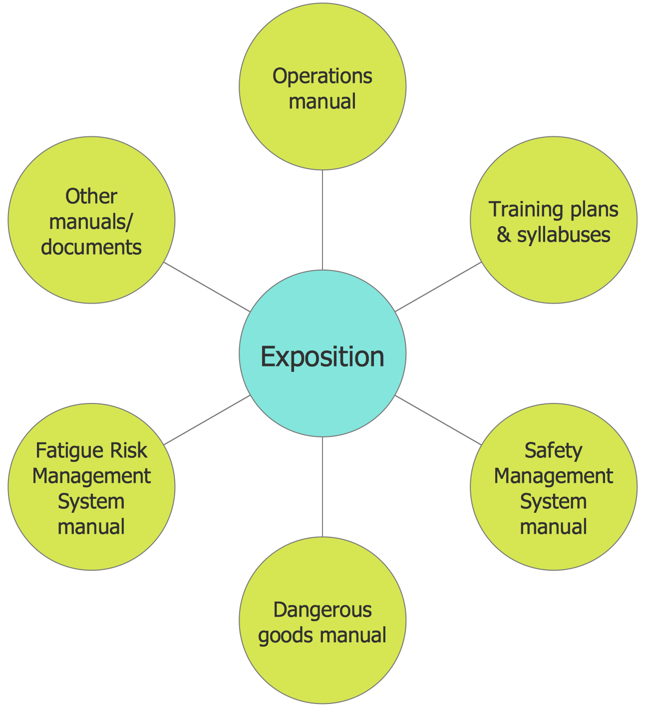 This sample visually depicts what a Spoke diagram is. It represents a Circle-Spoke Diagram showing various documents and manuals relating to the CASA exposition. The diagram was designed by means of ConceptDraw's tools and ConceptDraw’s circle spoke diagram template on the base of the image shared on the website of the Civil Aviation Safety Authority (CASA) at the "What is an exposition?" article. While CASA is an organization controlling the execution of the safety standards and rules by the aviation industries, the exposition is an official document that describes the ways of maintaining the required level of safety within an organization. This document is supported by the set of manuals that are listed in a diagram, among them the operations manual, training plans and syllabuses, Safety Management System manual, dangerous goods manual, Fatigue Risk Management System manual, and other manuals and documents. A color scheme using a single color for all elements except the middle one was employed for the diagram's clarity.