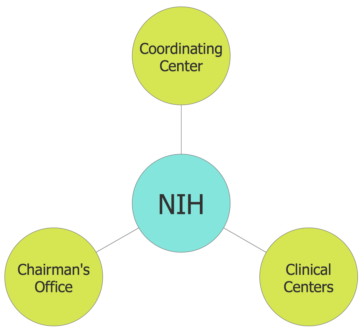 What is a Circle Spoke diagram? The Circle-Spoke and Circle diagrams are an incredibly convenient way for visual structuring of information. This diagram is devoted to illustration of the NIH (National Institutes of Health) structure, which is the largest biomedical research agency in the world. Founded in 1887 and situated in Bethesda of Maryland, it is included to the U.S. Department of Health and Human Services and comprises 27 separate institutes and centers. NIH is occupied by researches in different divisions of the biomedical science and other medicine and health-related fields, microbiology, cell biology, epidemiology, genetics, neuroscience, structural biology, etc. It includes two parts: the external part that is responsible for financing the biomedical researches outside of the NIH and the internal one that conducts researches itself. The diagram was constructed on the base of the illustration from the "Type 1 Diabetes TrialNet: Clinical Centers" webpage published on the U.S. National Institutes of Health (NIH) website and narrates that NIH includes the Coordinating center, Clinical centers, and Chairman's office.