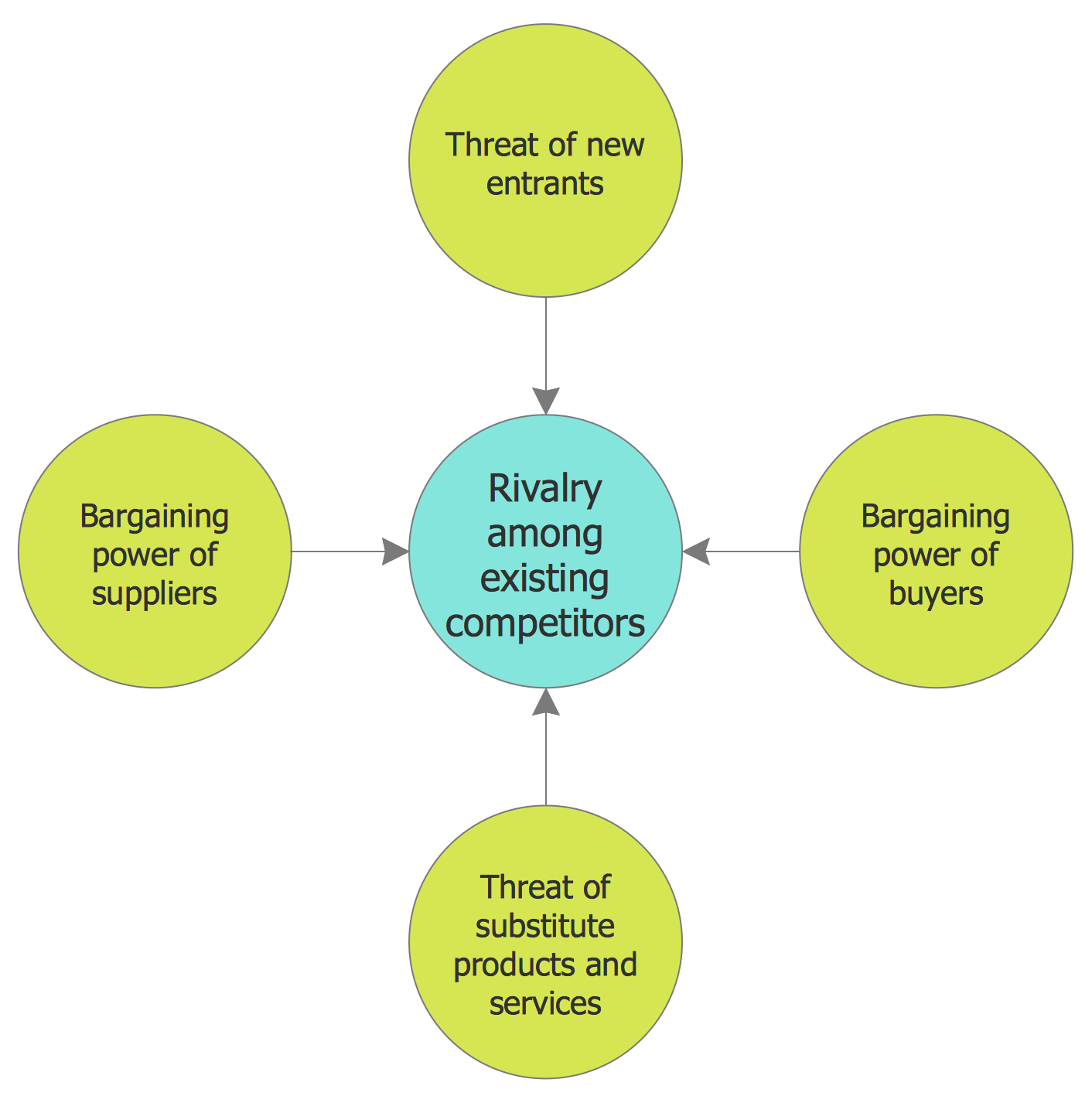 This Circle Spoke diagram sample is based on the Wikimedia Commons file "Modelo Porter.png" and illustrates the Porter five forces model, which is the most well-known and widely used model for the profitability evaluation of an industry and so its attractiveness. Developed by Michael E. Porter, this model is based on the identification of five competitive forces for the analysis of the industry and level of competition within it, as well as allows constructing an effective business strategy. There are represented three horizontal competition forces: the threat of new entrants, the threat of substitute products and services, and rivalry among existing competitors; and two vertical competition forces: bargaining power of buyers and also bargaining power of suppliers. The degree of rivalry between existing companies in the market is one of the most important forces, because the competing companies are those who influence the market and specific industry, and define the prices, profits, and strategies.