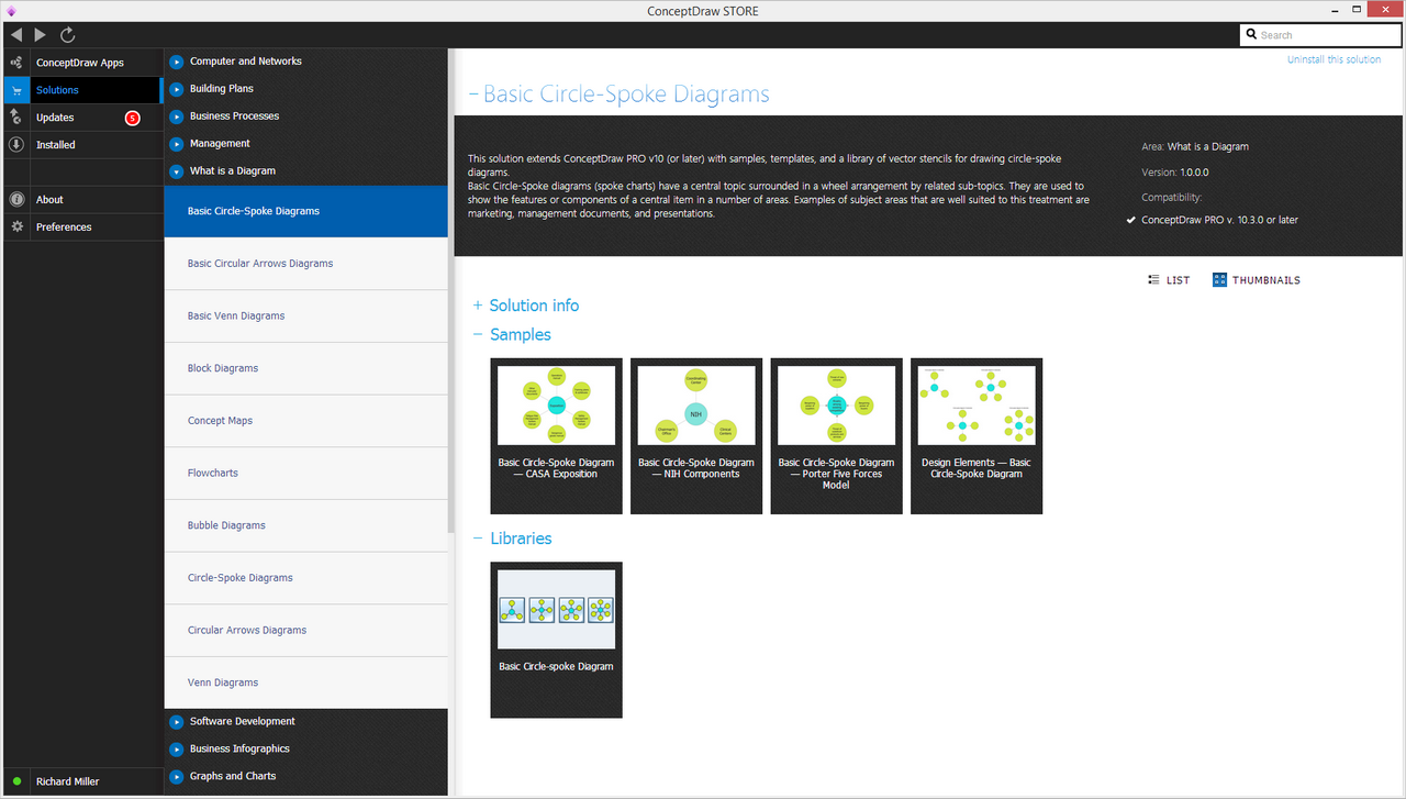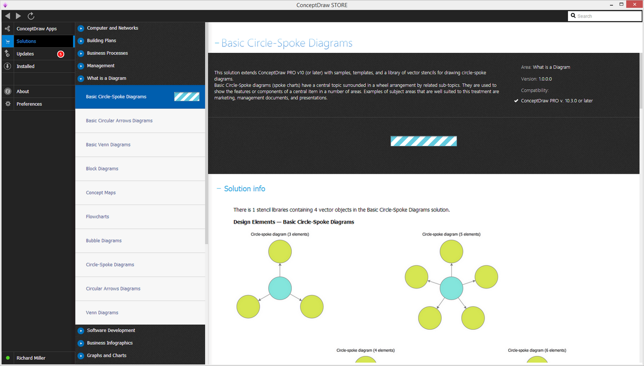 After ConceptDraw STORE and ConceptDraw DIAGRAM are downloaded and installed, you can install the Basic Circle-Spoke Diagrams solution from the ConceptDraw STORE.