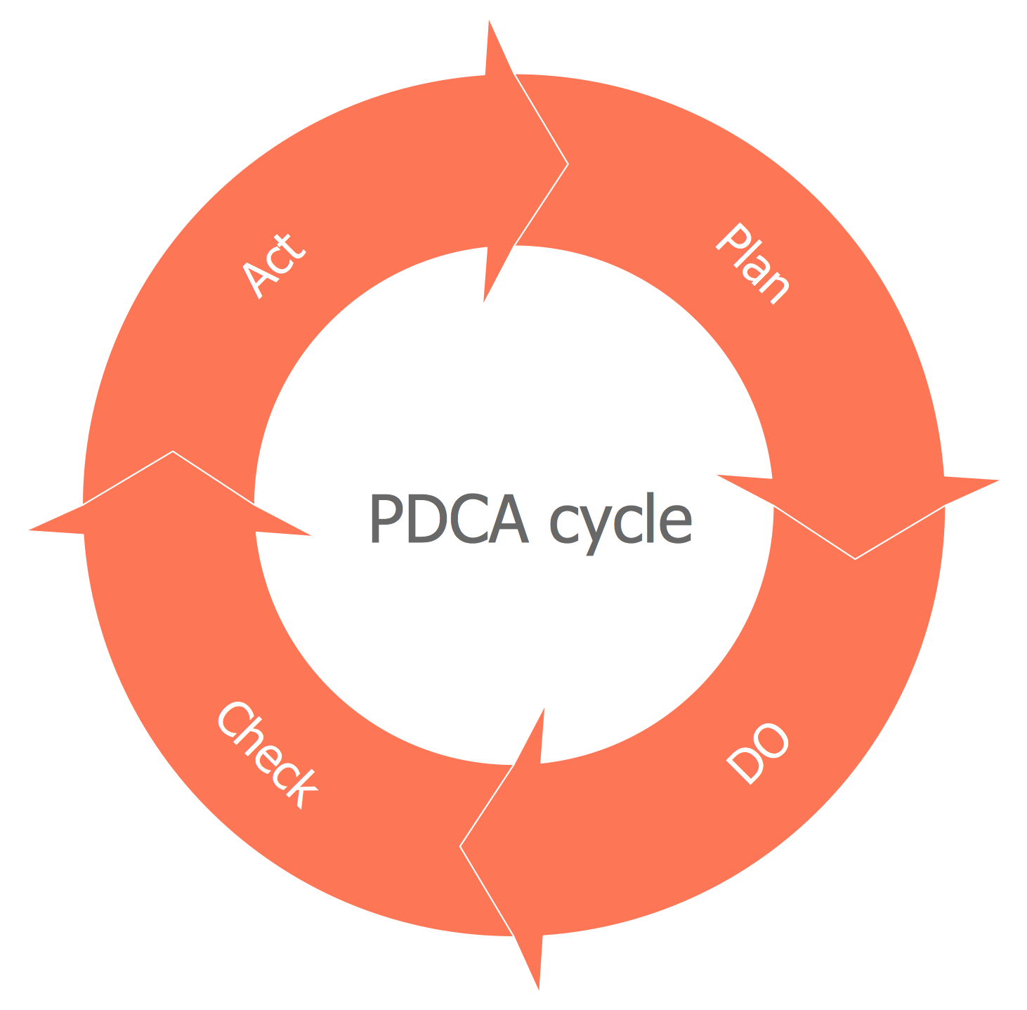 This sample shows the steps in the PDCA cycle, which stands for plan-do-check-act. The PDCA is the simplest manager’s action algorithm to manage the process and achieve the main process goals. It is an iterative decision-making management method that consists of four steps and is widely used in business for the control and continuous improvement of products and processes. The management cycle begins with planning, setting goals and defining processes to achieve these goals, as well as distributing the necessary resources. Then follows the process of performing the planned work, monitoring and checking the received result based on the key performance indicators, identifying and analyzing deviations. If some deviations were identified, they are analyzed, their causes are determined and measures are taken to eliminate these deviations, as well as changes in the planning and allocation of resources. The Circular Arrows Diagram with arrows is ideal for visually displaying similar charts.
