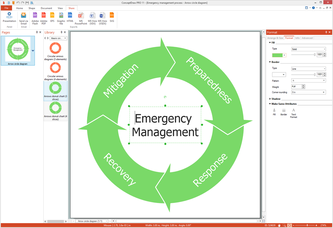 This Circular Arrows Diagram sample visually illustrates four stages of the emergency management exercise cycle such as a strategy plan, design and development, conduct and evaluation, and improvement planning. This sample is based on the illustration from the website of the Federal Emergency Management Agency (FEMA) of the US Department of Homeland Security. The Emergency management plans are obligatory and incredibly useful in such emergencies as earthquakes, hurricanes, fire, terrorism, industrial sabotage, public disorder, and other failures and accidents. They were created as part of emergency management and are aimed at reducing vulnerability to hazardous events, quick response and successful recovery from natural disasters. The correct choice of a diagram's type to represent your data, ideas, and other useful information, as well as its coloring style, allows you to achieve maximum success during presentations, reports, conferences, etc. The use of a Circular Arrows Diagram is perfect for this case and the two-coloring is also justified.