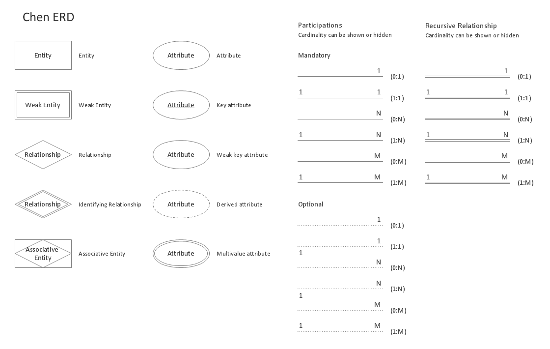 This sample diagram using the Entity-Relationship Diagram (ERD) Solution shows the type of icons and graphics you can use to develop a model of a database of arbitrary complexity according to Chen's notation.