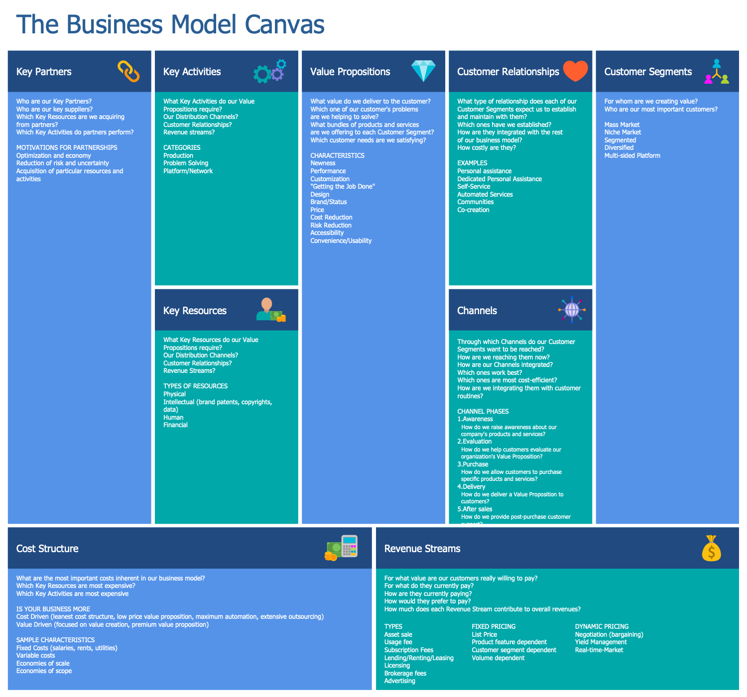 This sample illustrates the canvas of Alexander Osterwalder’s business model, which includes nine building components that depict the organization’s steps towards value creation. These components cover the fundamental areas of any business: customer segments, value propositions, channels, customer relationships, revenue streams, key resources, key activities, key partners, cost structure. All components are represented at their own boxes in the diagram and represent the main questions. It is considered the value, bundles of products and services that are delivered to customers, the customers and their problems that can be solved, the correspondence of proposals to the needs, the cost-efficient channels through which the customer segments are reached, the preferable types of established relationships with customers, their cost and integration with the rest business model, the customers’ preferences for the payment, the most important things that need to be done to construct the working business model, key partners and suppliers, key activities, key resources required to create the value propositions, distribution channels, customer relationships, revenue streams, and many other questions.
