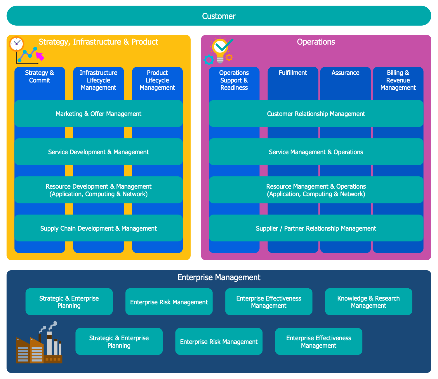 This Economy infographic sample represents the overview of the Business Process Framework (eTOM), the key elements and eTOM processes of Level 0. The business architecture and business processes have a great value today and the interest for this field dramatically grows from year to year, as well as its development. This model framework describes the required business processes of service providers and how they interact with each other. It is a standard maintained by the TM Forum that is an association for service providers and suppliers in the telecommunications and entertainment industries, so it is the main standard used in the telecommunications industry. The Business Process Framework (eTOM) became known in 2010 when the first handbooks in this business architecture were published. This economy infographic represents the information in a detailed but simple view and is visually structured, you can observe three main blocks, the first one represents the strategy, infrastructure, and product, the second includes the operations and the third describes the enterprise management.