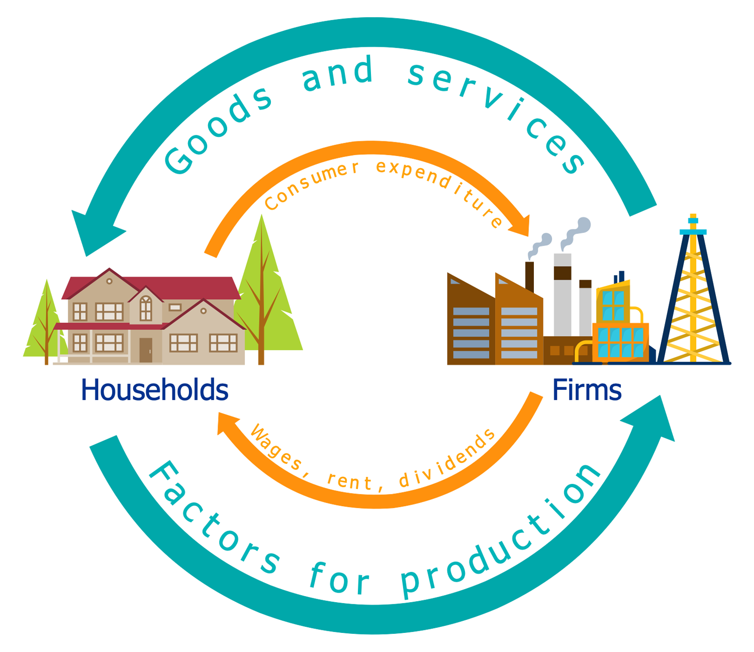 This Economy Infographics sample represents the circular flow of goods income and expenditure. The two-directional interactions between the households and firms are represented, the interdependence of the flows that occur in the economy from the goods' production and the income generated from that production. This basic diagram provides a better understanding of the market economy as a whole considering it as consisting only from the businesses and individuals, at this the last ones ensure the labor that enables the businesses to produce different goods and provide services. The blue arrows in the diagram represent these activities — flows of goods and services, and factors for production. Along with them the monetary flows also occur, the individuals realize the labor activity in exchange for payment of businesses. This payment is the individuals' income that is in its turn spent on the goods and services produced by businesses. These opposite flows of consumer expenditure and wages, rent, and dividends are represented by orange arrows in the diagram.