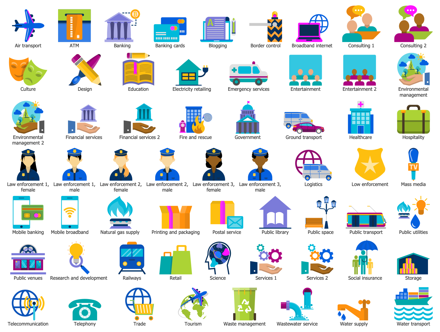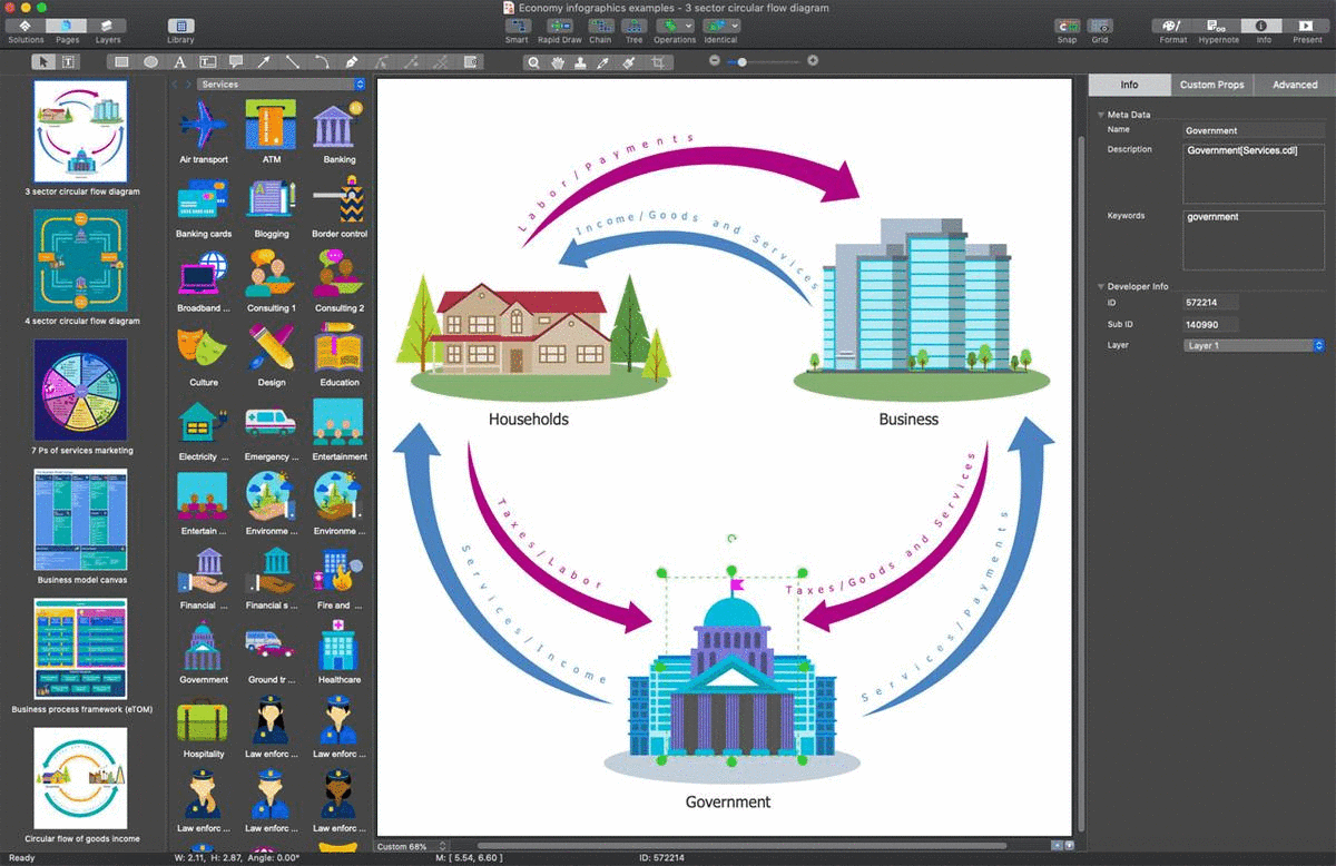The Economy Infographics solution provides ConceptDraw DIAGRAM software with a large collection of vector icon libraries, drawing samples and infographic examples for quick and simple design of the high-value visuals: infographics, illustrations, presentations and diagrams about economics, markets and economic policy, business and finances, government and social institutions, production, distribution, and consumption of goods and services. Use it for fast and convenient design of the best infographics consisting of vector clipart along with text blocks and charts, economic diagrams and schemes illustrated with vector icons, economic activities designs, continent and country economic maps, economic presentations, market economy and economic system infographic charts, illustrations in economic articles, reports in mass media, and blog posts in social media.