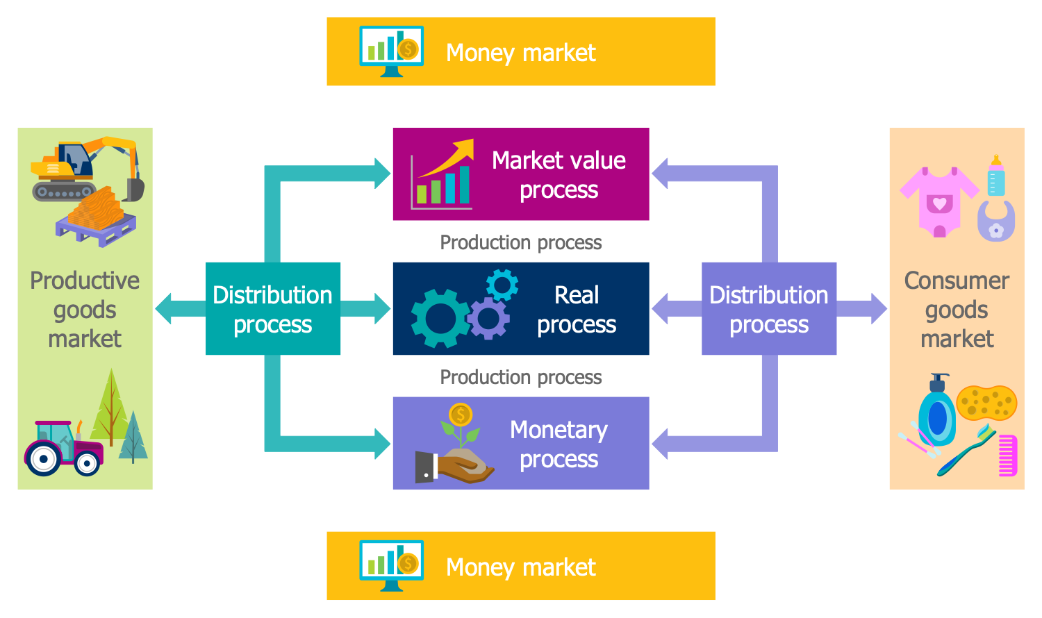 This piece of infographics illustrates the main processes that are realized within a company. The real process, production process, distribution process, market value process, and monetary process are defined among them. Each of these processes has its own goals, logic, theory, and key figures. Any company is unique and its processes can be allocated in different ways, but the listed ones are the main for each company and in addition to them may be some others. The production process, real process and distribution process occur simultaneously. The production process contains the production of goods, their distribution between different markets and income distribution as well. According to the diagram the distribution to the productive goods market and consumer goods market is carried out. The monetary process includes all questions connected with the business financing. The market value process is a process during which the market value of the company in the investment markets is determined. Any of ConceptDraw’s infographics examples can be used as a good start for your own infographics.