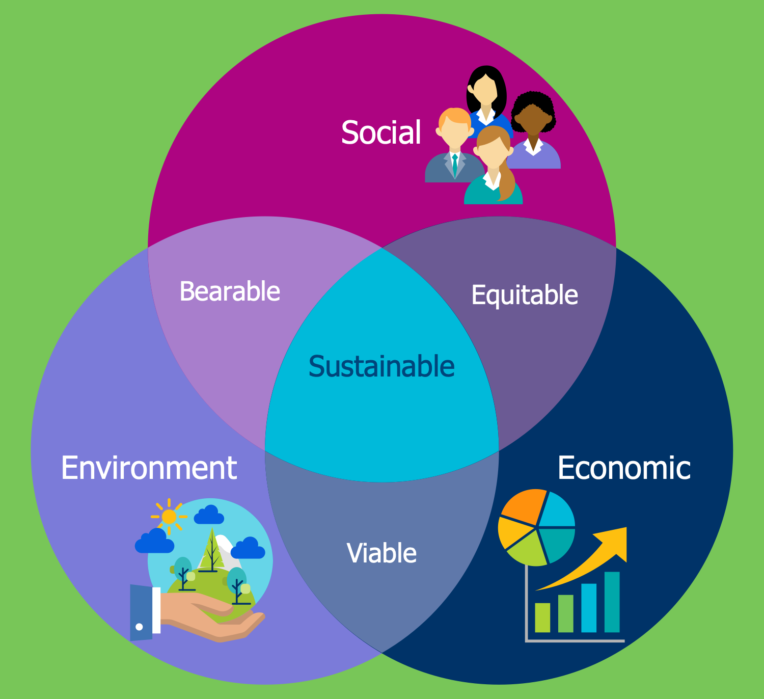 This Economy infographic sample is dedicated to sustainable development at the confluence of three constituent parts, such as environment, economy, and society. The sustainable development is a process of economic and social change in which the exploitation of natural resources, the direction of investment, the personal development, the orientation of scientific and technological development, and other changes are aligned and strengthen the current and future capacity to meet human needs and desires. This concept is directed on the ensuring the quality of life of people, achieving the human development, economic system development, and social development at the saving the integrity and stability of the natural system for future generations, saving its ability to provide the natural resources so that future generations can also meet their needs. The represented sustainable development three-sphere structure was offered by the economist Rene Passet in 1979. Each sphere is visually colored in the diagram making it colorful, bright and attractive.