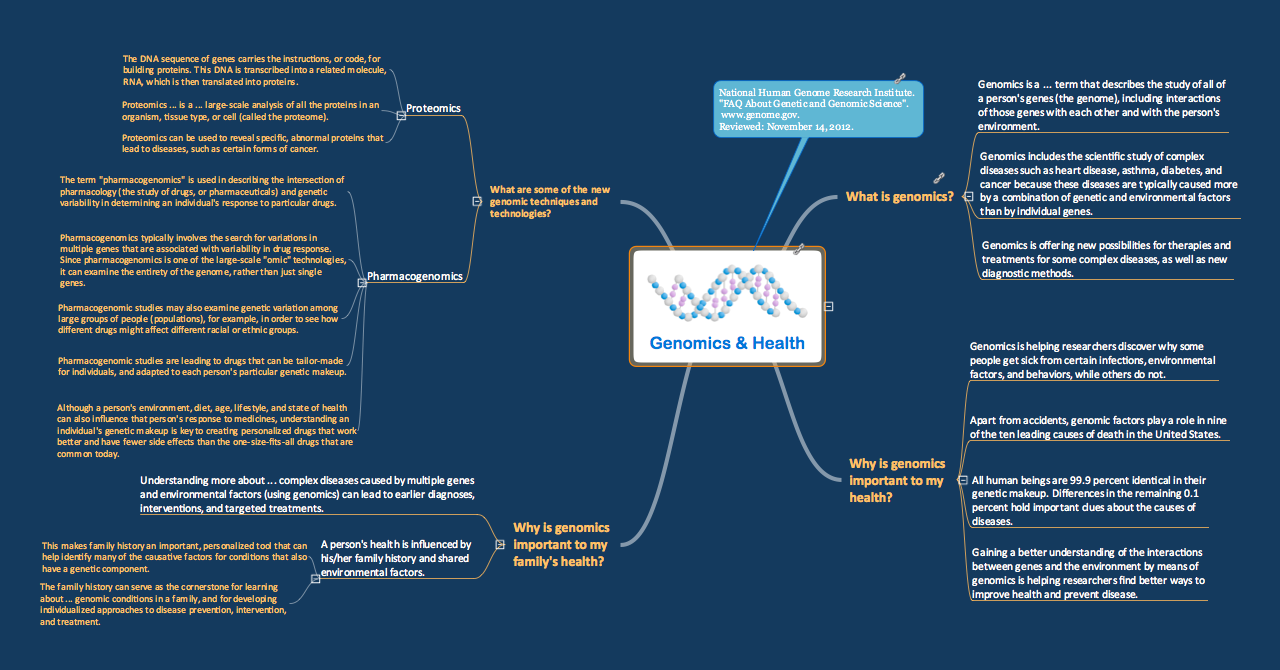 This map was created from content found at "FAQ About Genetic and Genomic Science" (National Human Genome Research Institute, www.genome.gov) and shows how simple in is to use a map structure to explain complex subjects. The content from this map and maps similar to this can be used with the eLearning for Skype solution for ConceptDraw MINDMAP to present complex information in a simplified manner.