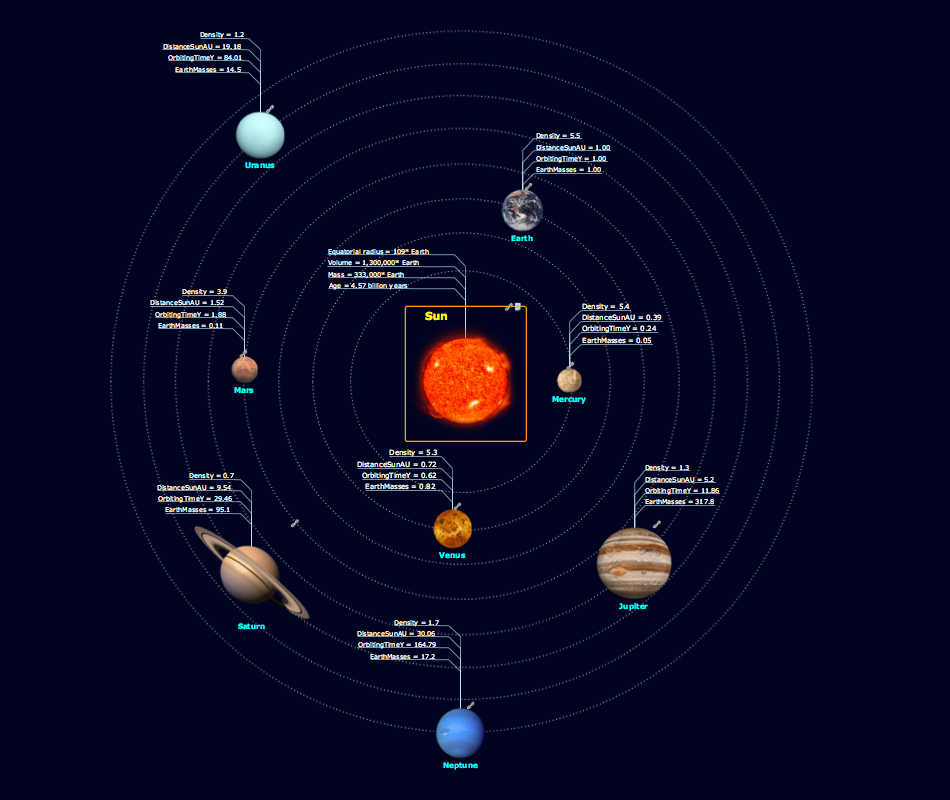 Here is a visual presentation of the Solar System's structure. Highly visual documents of this type can be presented to others using ConceptDraw MINDMAP in conjunction with the eLearning for Skype solution.