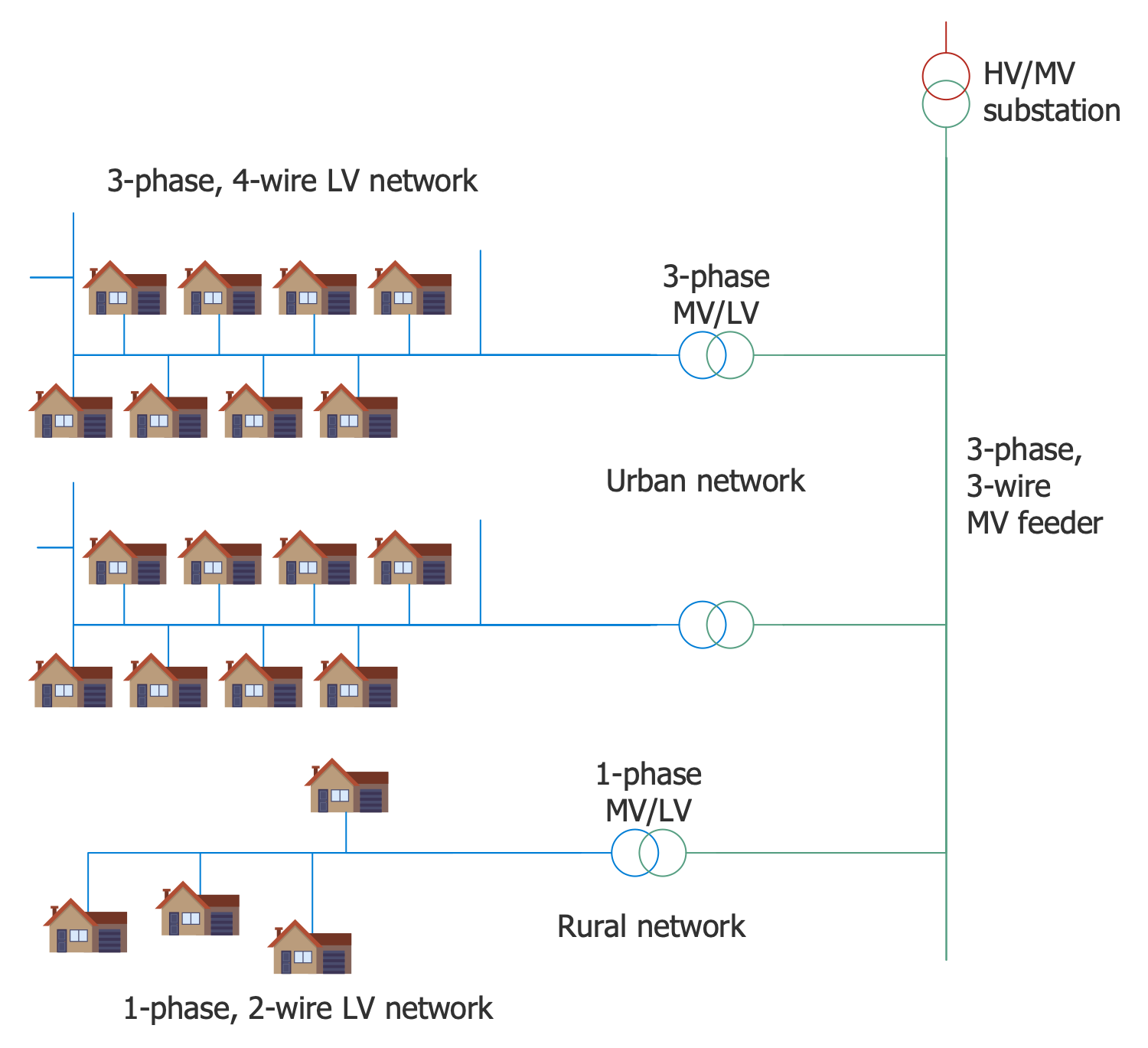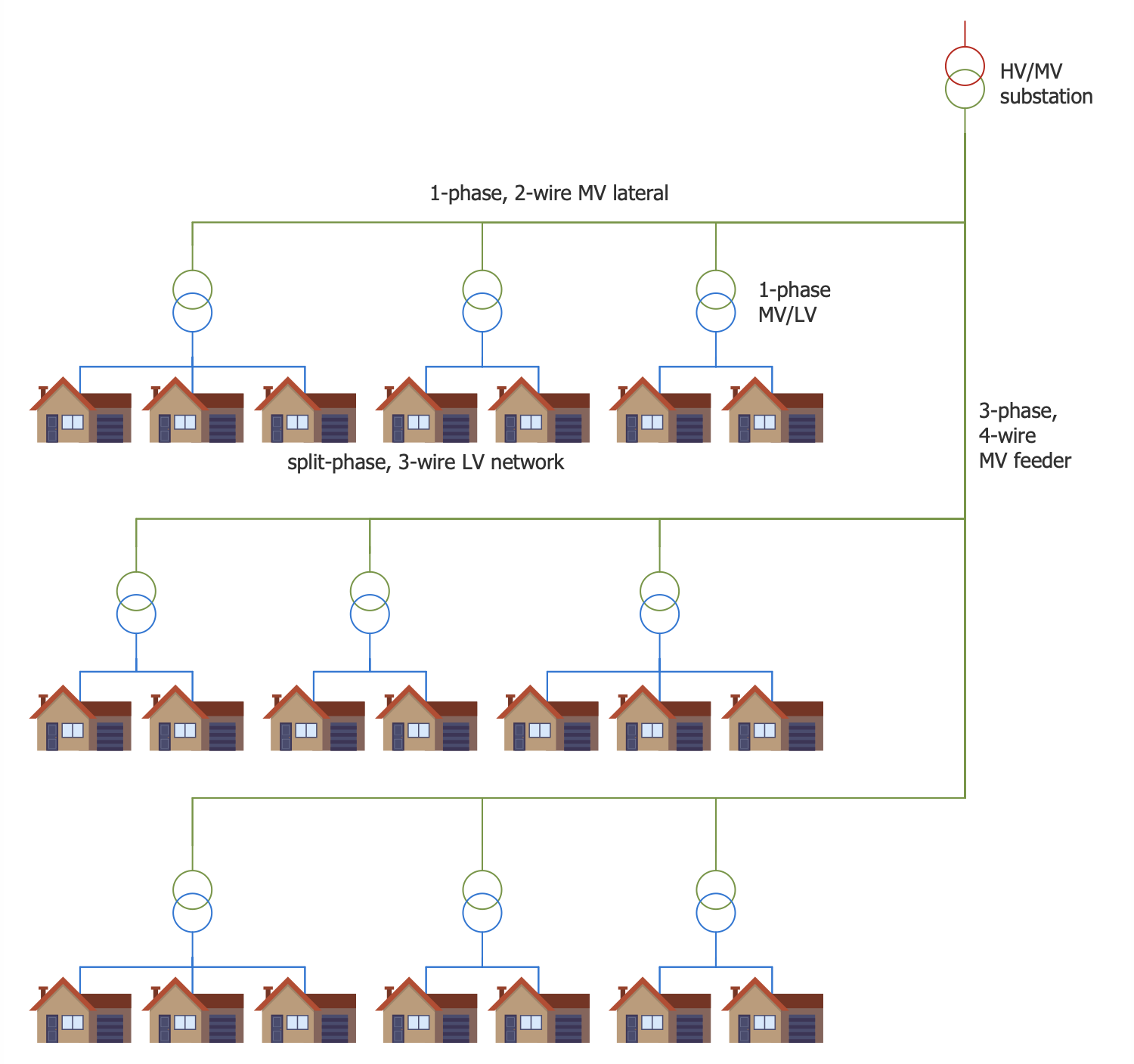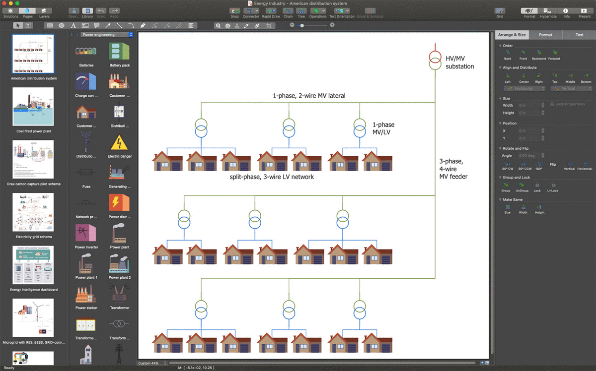 Electric power distribution systems are used to supply customers with the electrical power of corresponding voltage. The system consists of simple radial circuits (feeders). The feeders carry the power from the distribution substations to the end consumers. This sample shows a layout of a typical American electric distribution system. The energy is carried from HV/MV substation by 4-wire feeders. 3-phase distribution transformers are used and arranged along feeders. They convert the voltage from the high to medium level. The 1-phase transformers are used to convert the electric energy voltage from medium to low level suitable to be delivered to end consumers. It must be equal to the operating voltage of electrical appliances. 120V voltage is standard for America. Small distribution transformers (25-50 kVA) are located close enough to consumers and are interconnected by a bus. Using ready-made vector stencils and ConceptDraw alignment functions made this diagram very accurate.