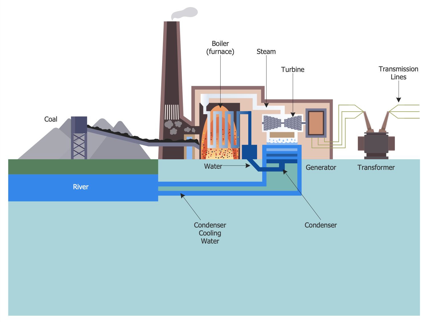 This sample shows a work of a coal-fired plant or coal-fired power station generating electricity by means of burning coal. Let's follow the chain of taken activities. Primarily coal is prepared, it is pulverized by crushing into small pieces and then crushed to a powdery consistency. The freshly prepared coal is mixed with the primary combustion air and fed into the pulverized coal boiler furnace. Here it is preheated to remove excess moisture and then incinerated. As a result, the water in the boiler heats up boils and steam forms. This steam ensures spinning of the turbines. In their turn, turbines drive a generator and it generates energy. In this way, chemical energy stored in coal is converted into useful electrical energy. Coal energy passes several states on this way. Primarily it is converted into thermal energy, then in mechanical one and, finally, in electrical. The ash received as a result of producing process is collected and disposed or recycled. The diagram was designed exceptionally by means of Energy Industry Infographics solution tools and predesigned vector energy industry symbols.