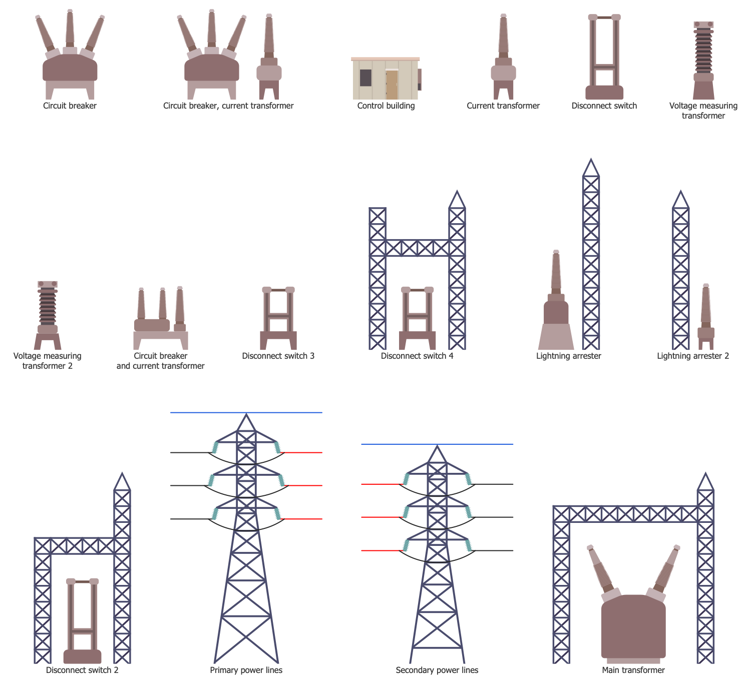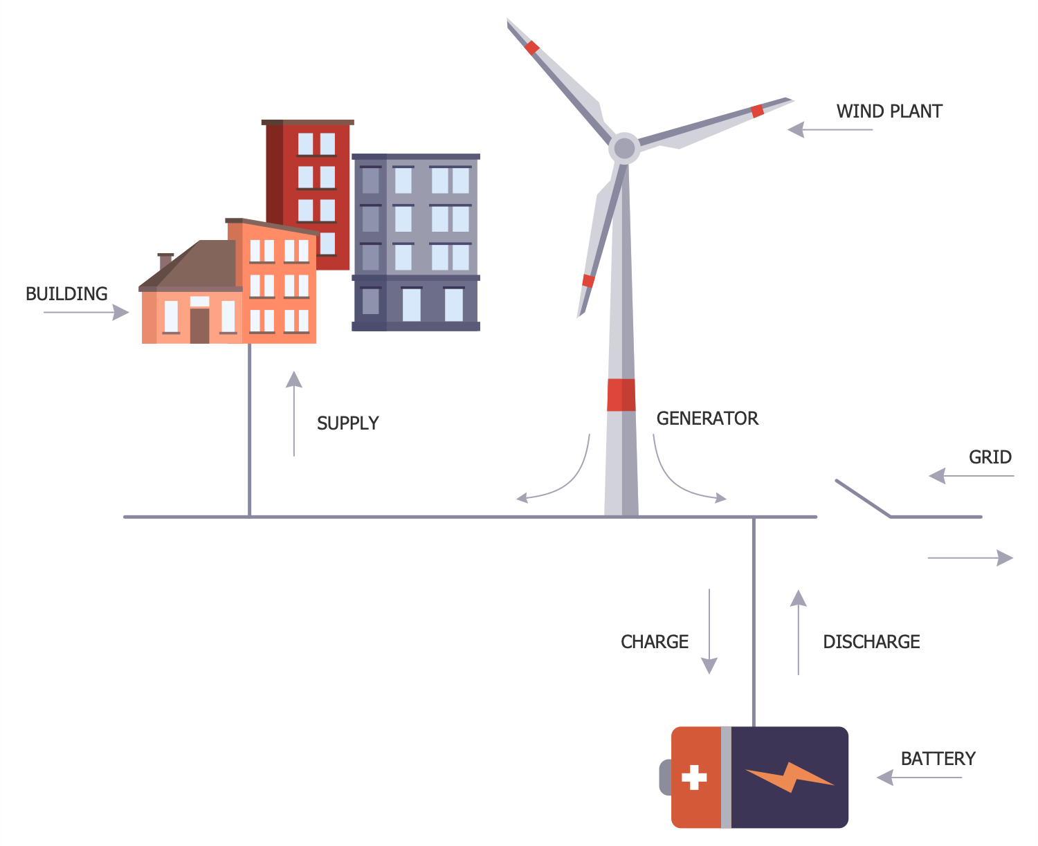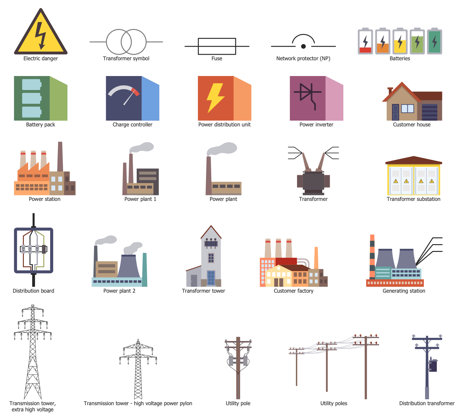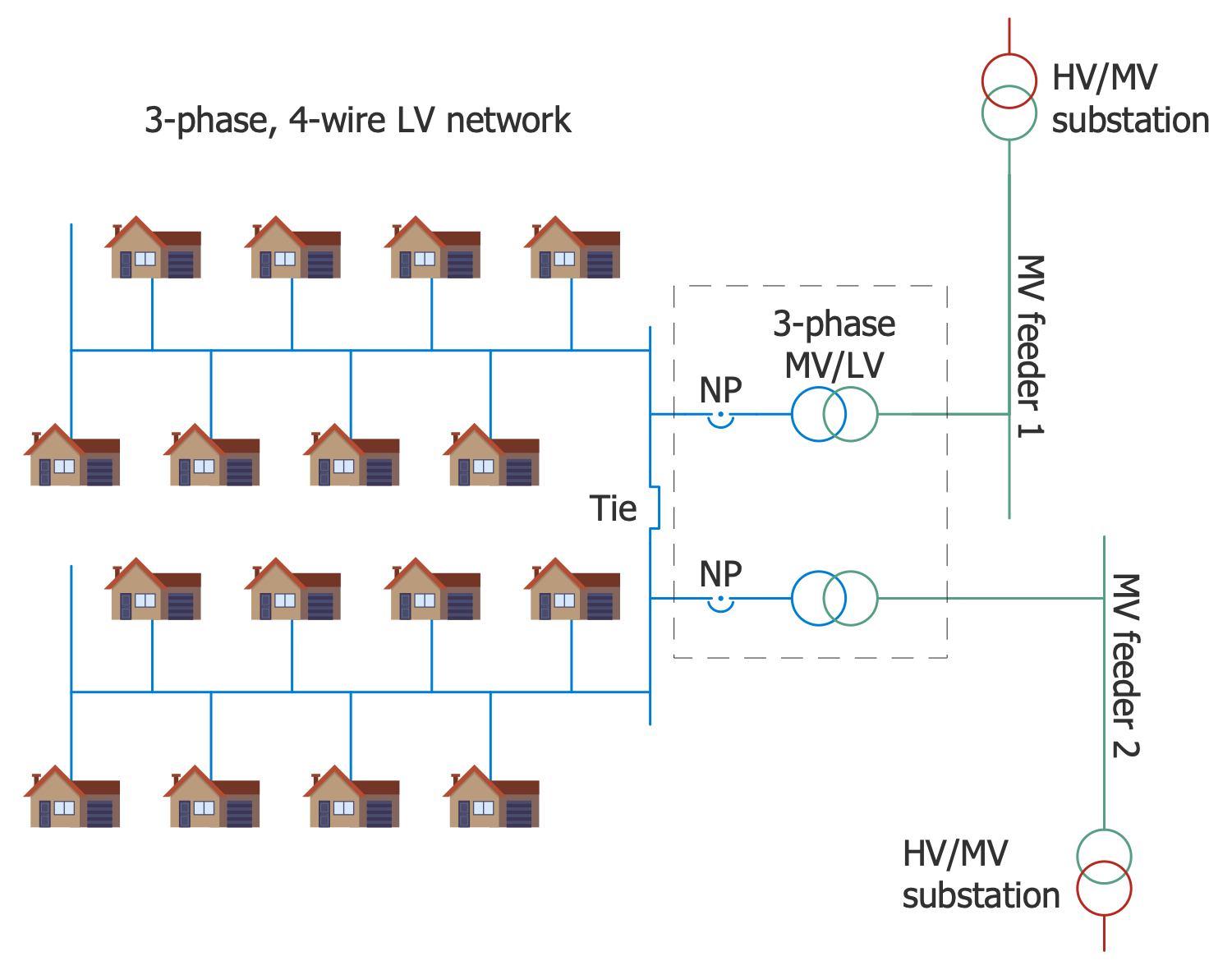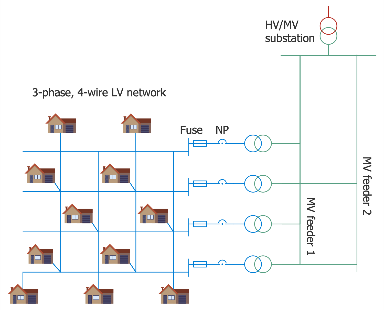This sample shows a layout of a grid low-voltage network. Grid networks include a grid of interconnected circuits. These circuits are energized from several primary feeders, at this energy goes through multiple distribution transformers. The grid is organized using multiple cables providing multiple paths from each transformer to each load on the grid. Usually, the connecting cables are laid underground. The individual cable sections in grid low-voltage networks are commonly protected by cable limiters on both ends and supplied with fuses. The fuses are used to provide short-circuit protection. When a strong short-circuit occurs, the cable limiters blow and cut off the faulted cable, in this way isolating the fault. In these conditions, the unaffected cables take over its load. Due to the typically inherent redundancy of the system its work isn't disrupted. The use of grid low-voltage networks is common for downtowns of large cities. All energy icons used in this diagram were taken from the Energy Industry Infographics solution libraries. They are accurate, vector and ideally suit for designing energy-related infographics and diagrams.